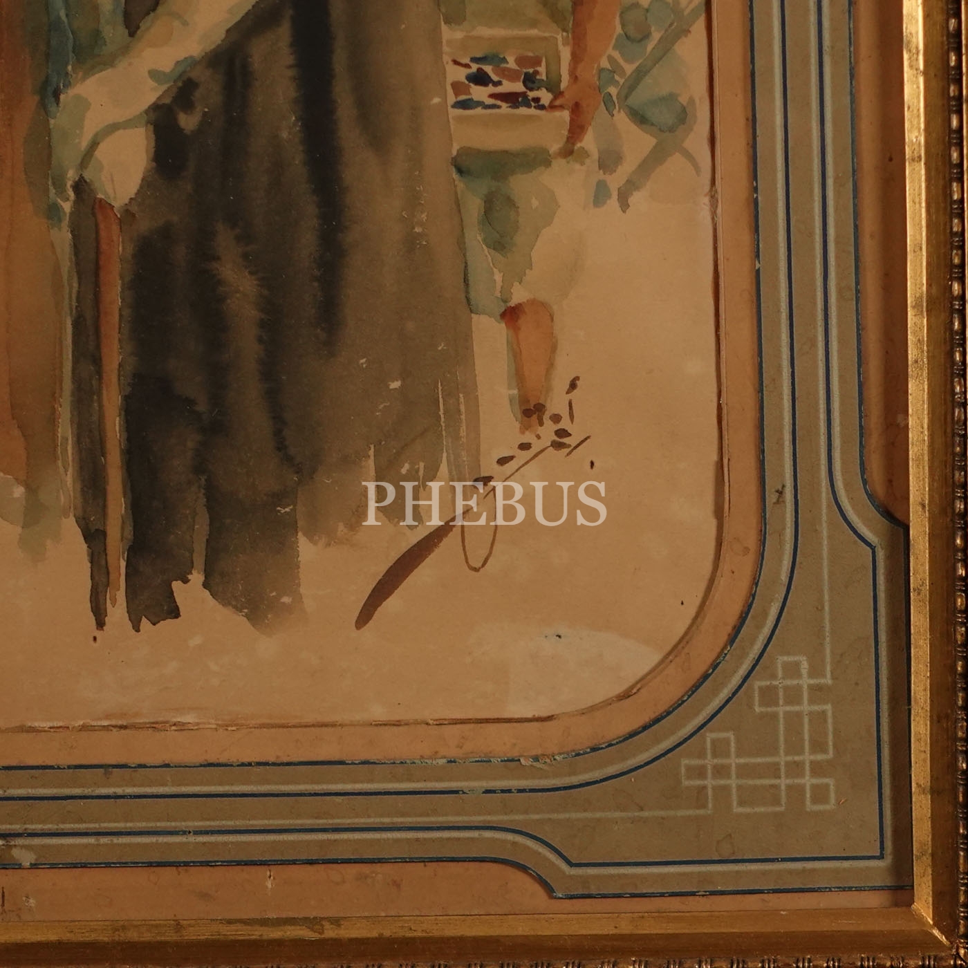 Rafet Başokçu (1885-1950) imzalı, kâğıt üzeri suluboya Galata Köprüsü´nde Türk kadını resmi, resim 38x55 cm, çerçeve 56x72 cm...