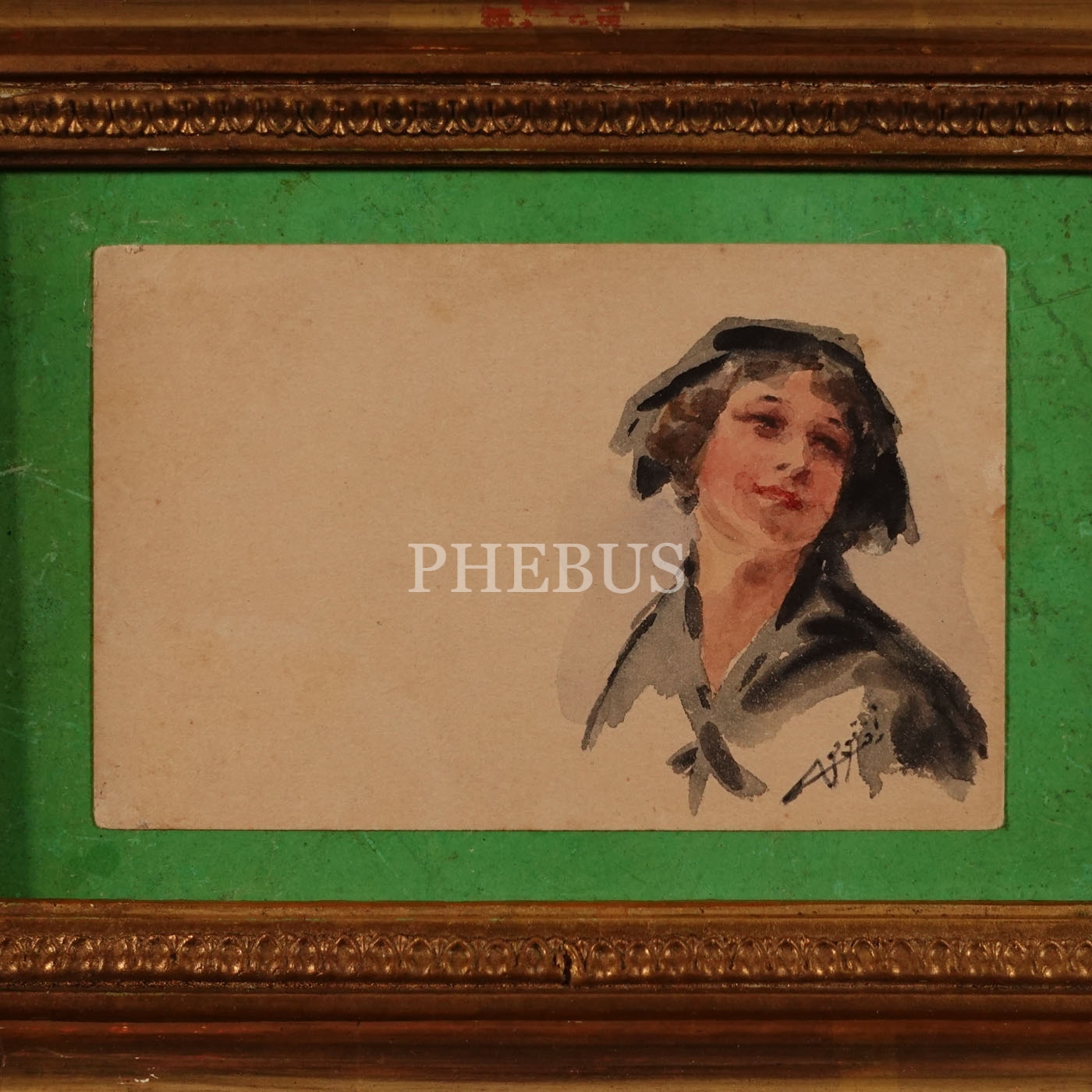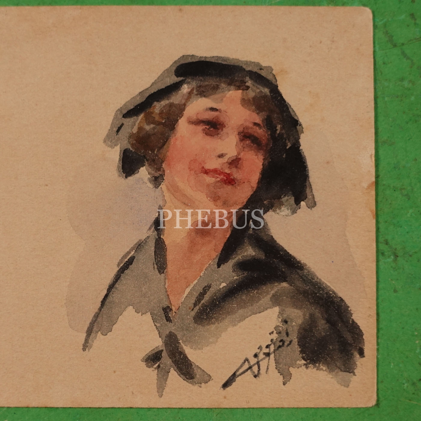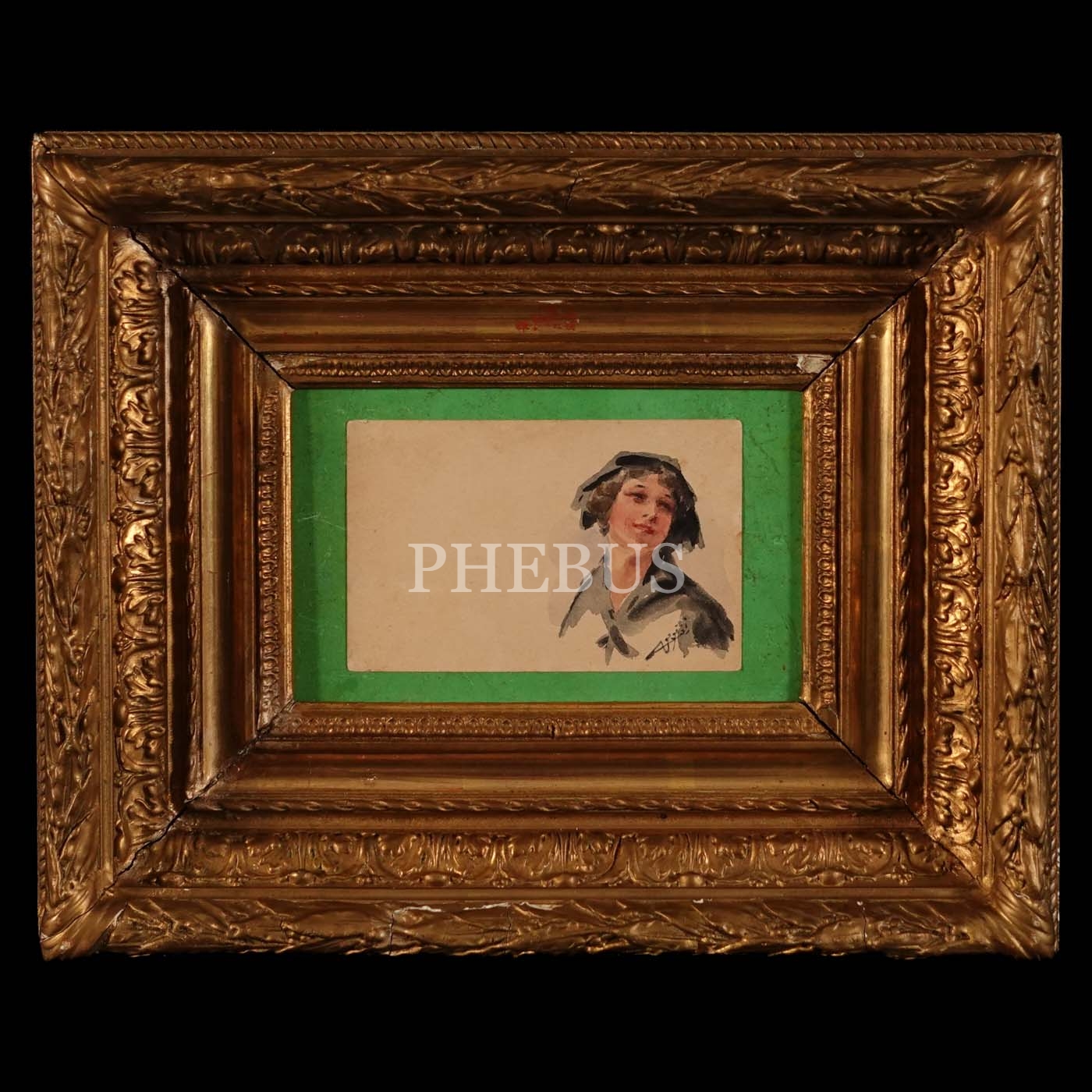 Rafet Başokçu (1885-1950) imzalı, kâğıt üzeri suluboya feraceli Türk kadını resmi, resim 14x9 cm, çerçeve 36x29 cm...
