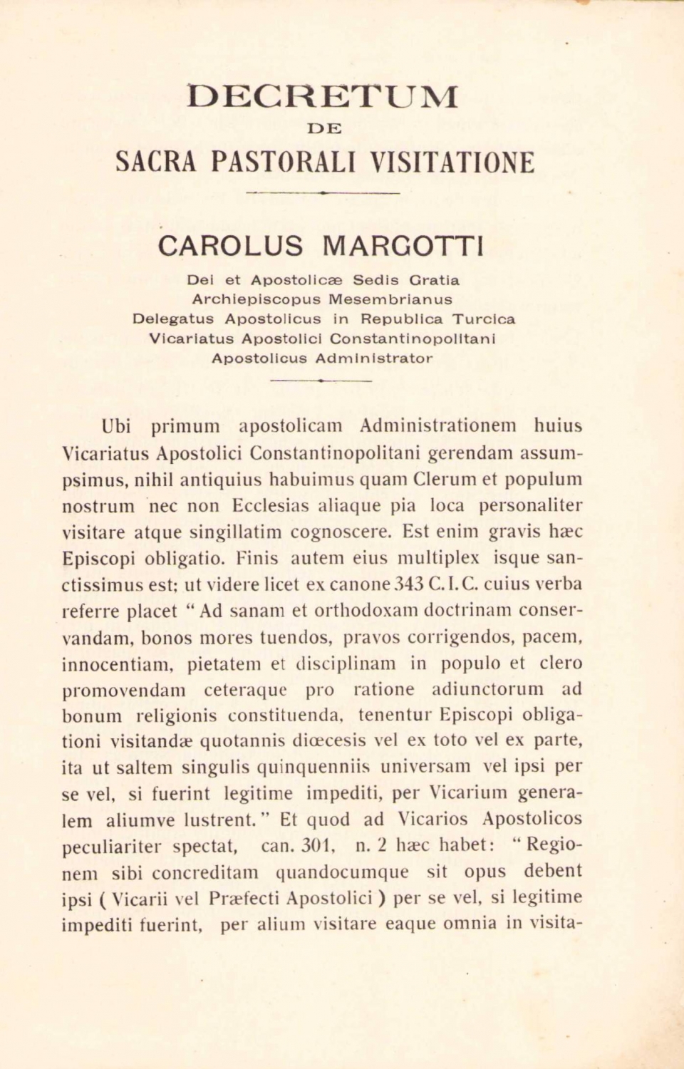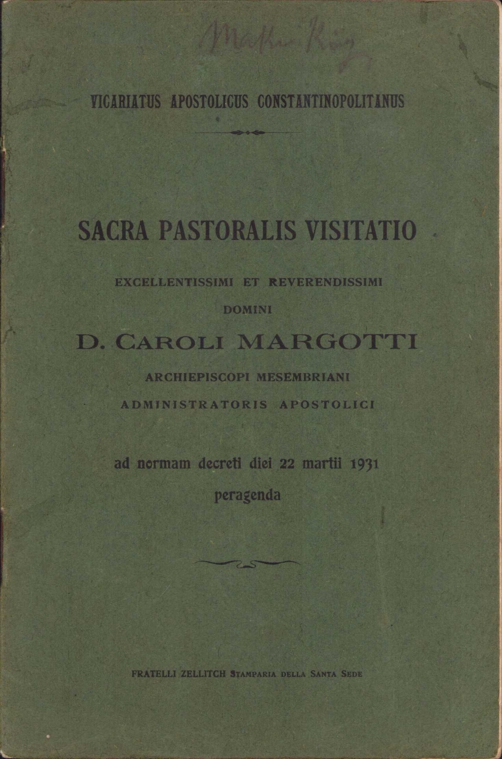 Vicariate Apostolic Constantinopolitanus, Sacra Pastoralis Visitation, D. Caroli Margotti, 1931, Latince, 15 sayfa, 13x19 cm