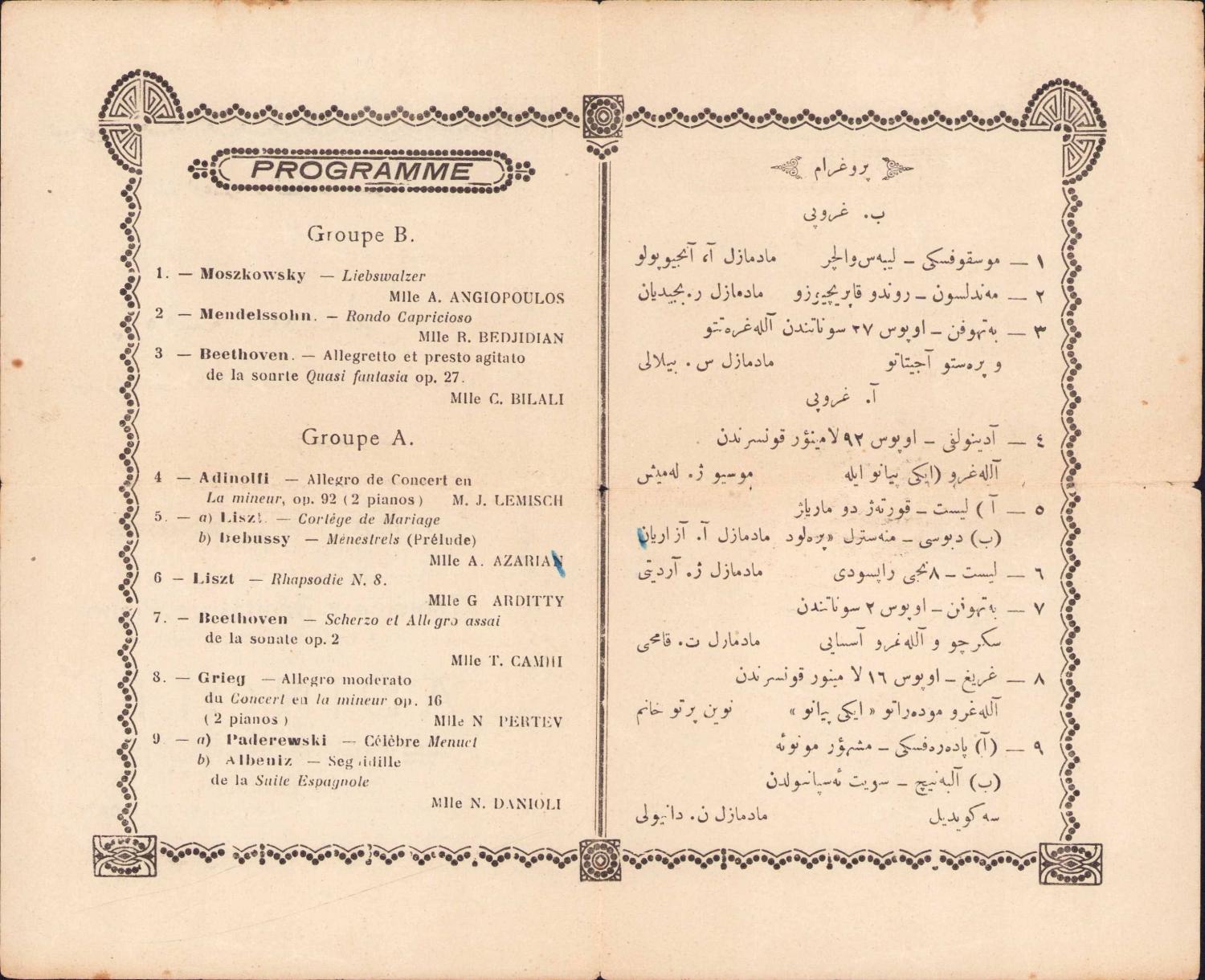 Osmanlıca - Fransızca Beyoğlu Fransız Tiyatrosunda düzenlenen Piyano resitali programı, 4 sayfa, 12x19 cm