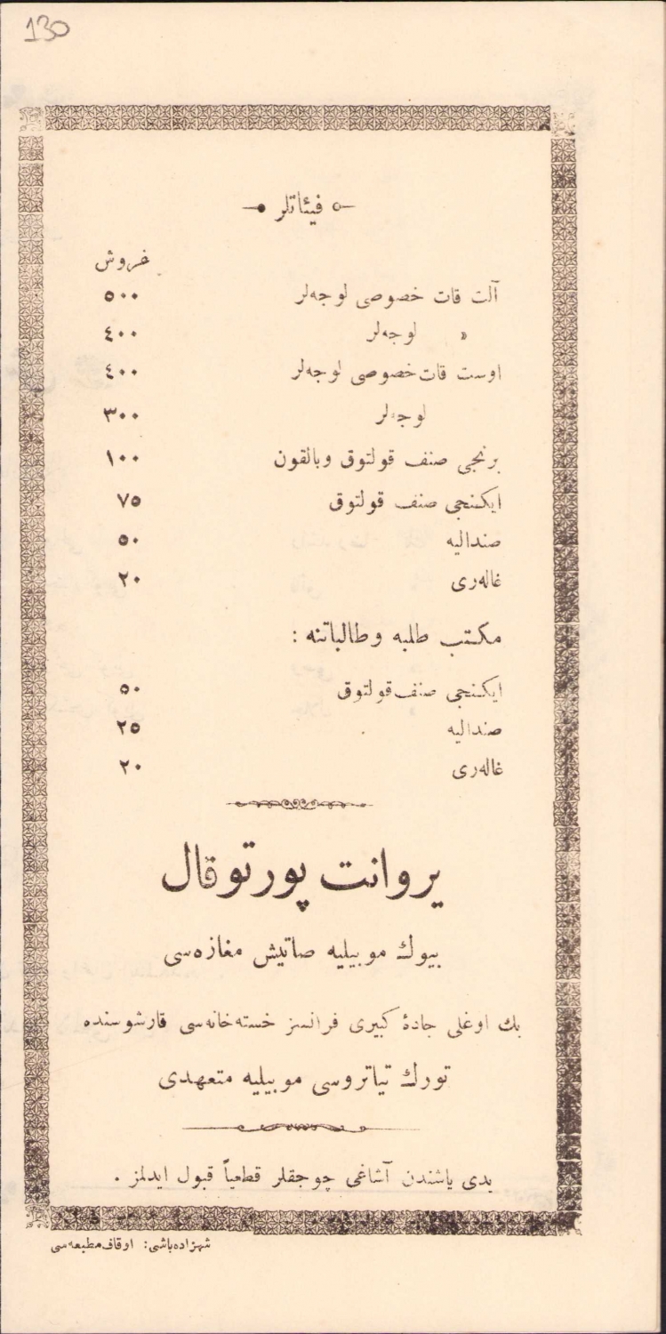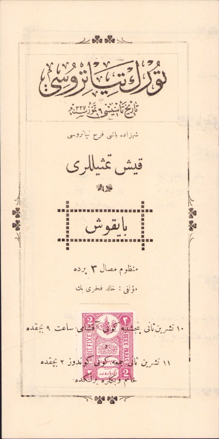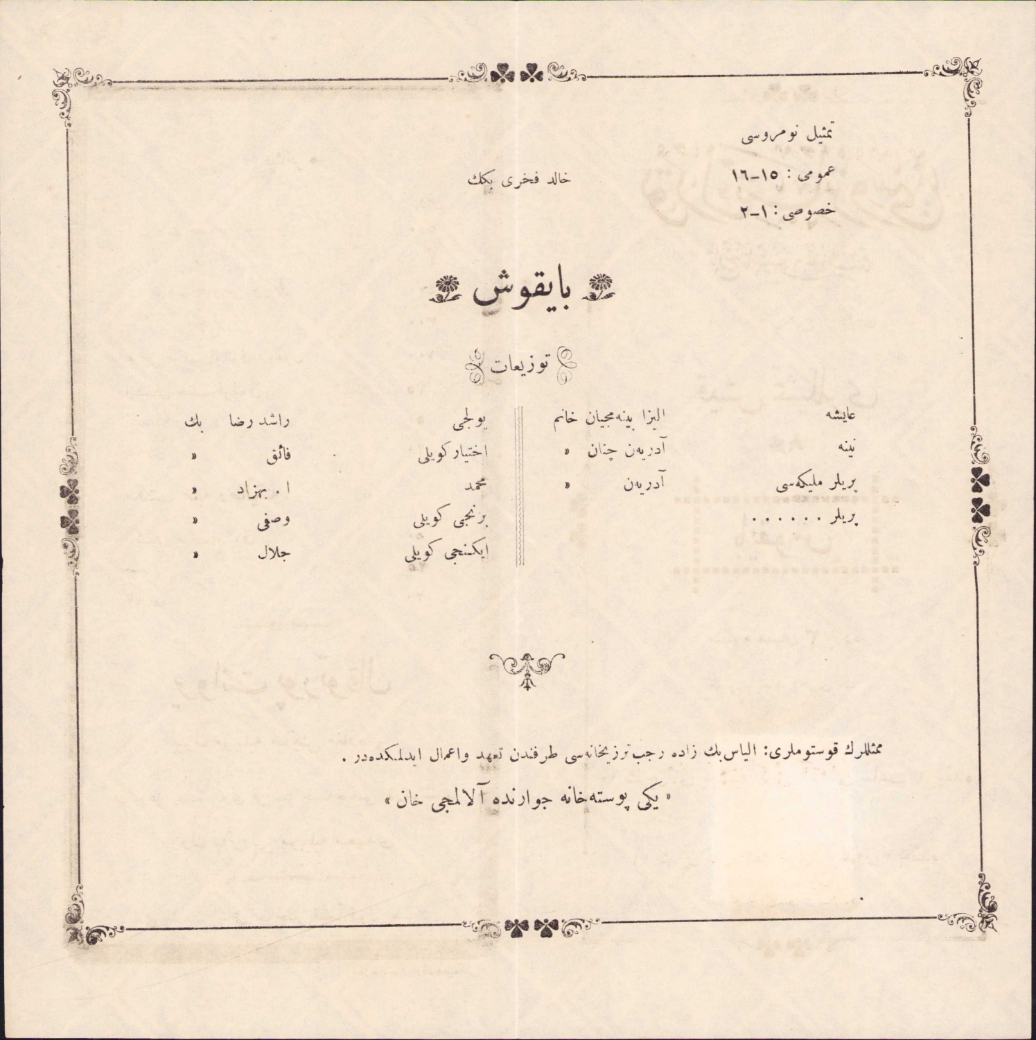 Osmanlıca Türk Tiyatrosu Halid Fahri Beyin 'Baykuş' isimli oyunun el ilanı, 11x23 cm
