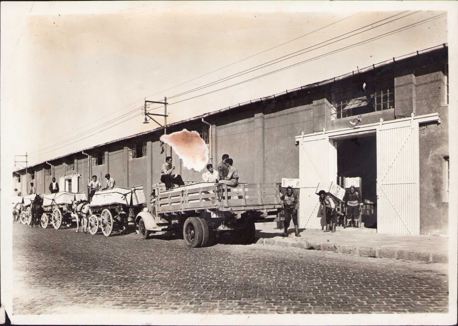 Osmanlı dönemi İzmir Tariş büyük imalathanenin önünde çalışanları, bir kenarı haliyle, 16x12 cm