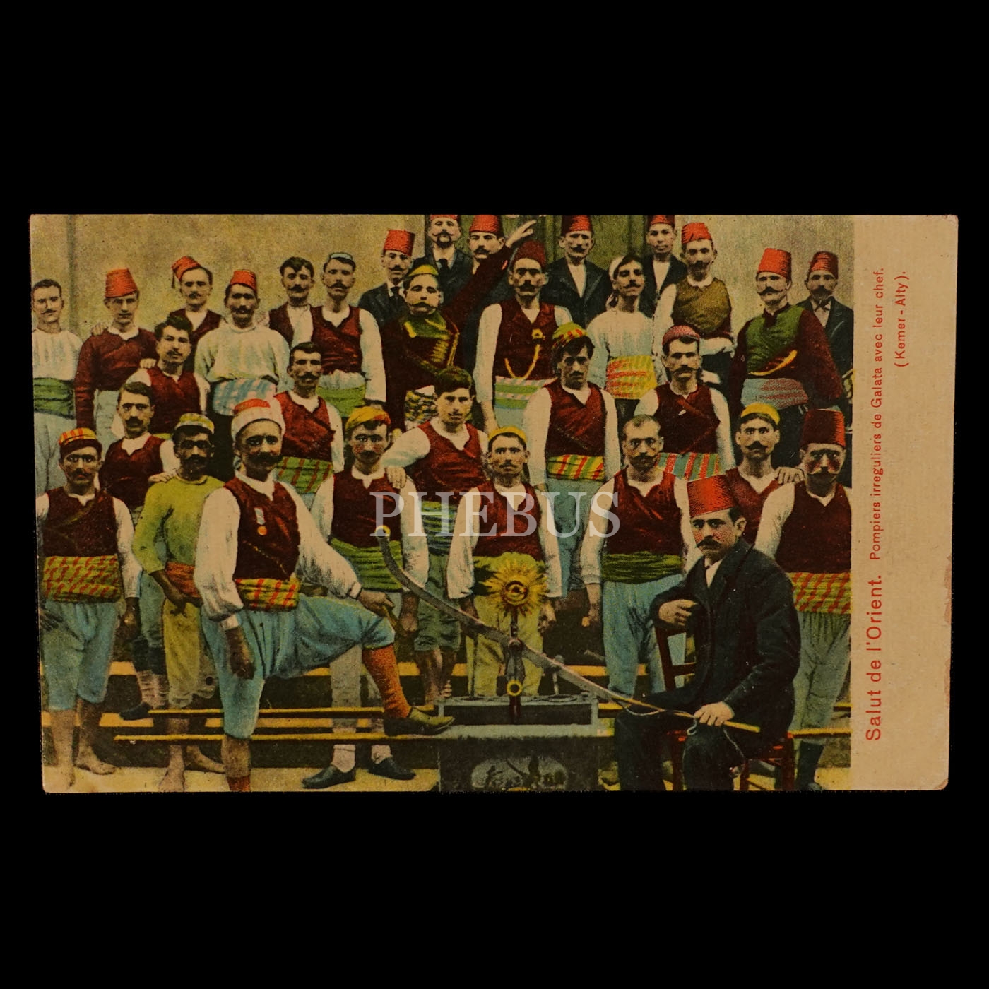 Galatalı tulumbacılar ve reisleri, "Salut de l´Orient - Pompiers irreguliers de Galata avec leur chef (Kemer-Alty)", 14x9 cm...