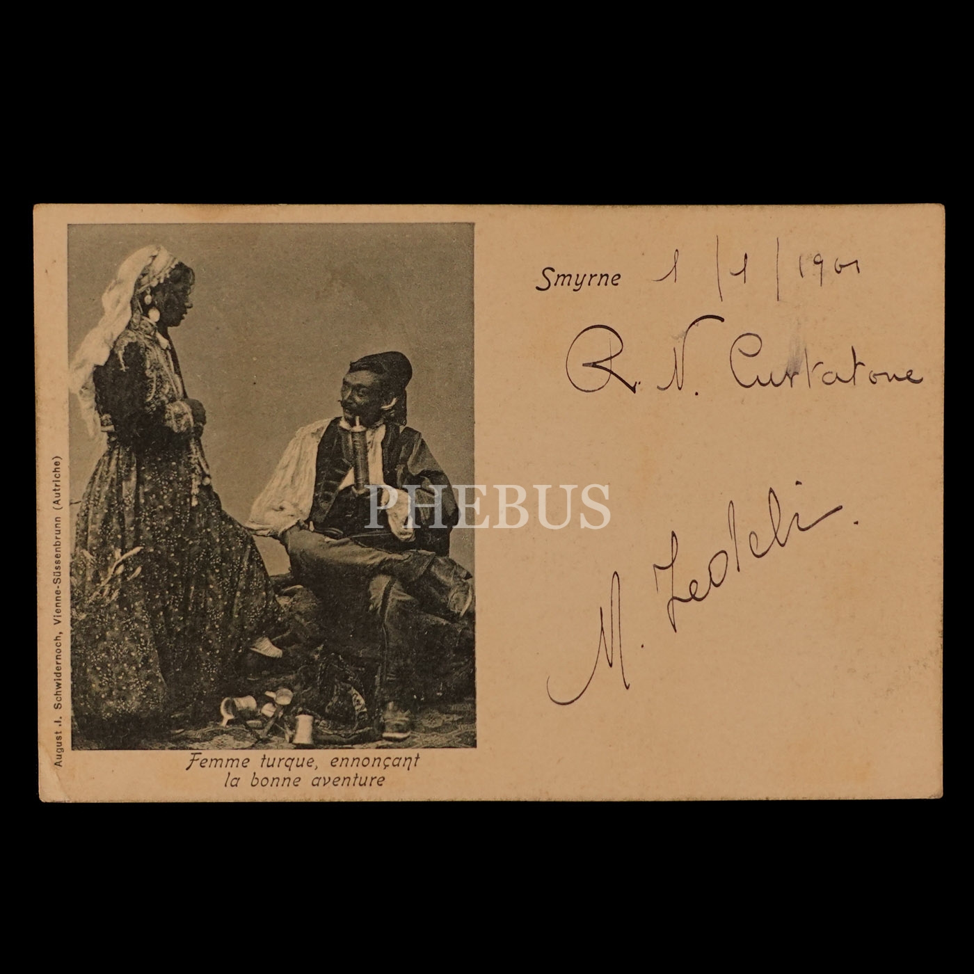 Fal bakan İzmirli Türk kadını, "Smyrne - Femme turque, ennoçant la bonne aventure", ed. August J. Schwidernoch, Vienne-Süssenbrunn (Autriche), 14x9 cm...