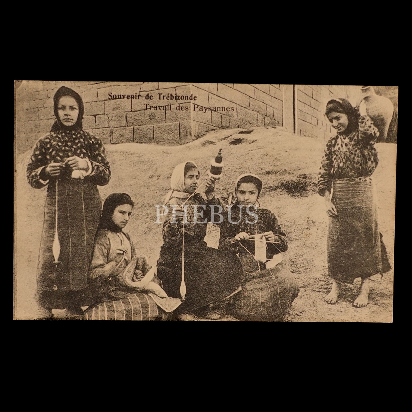 Yün eğiren Trabzonlu köylü kızlar, "Souvenir de Trebizonde - Travail des Paysannes", ed. O. Nouri, Trebizonde, 14x9 cm...