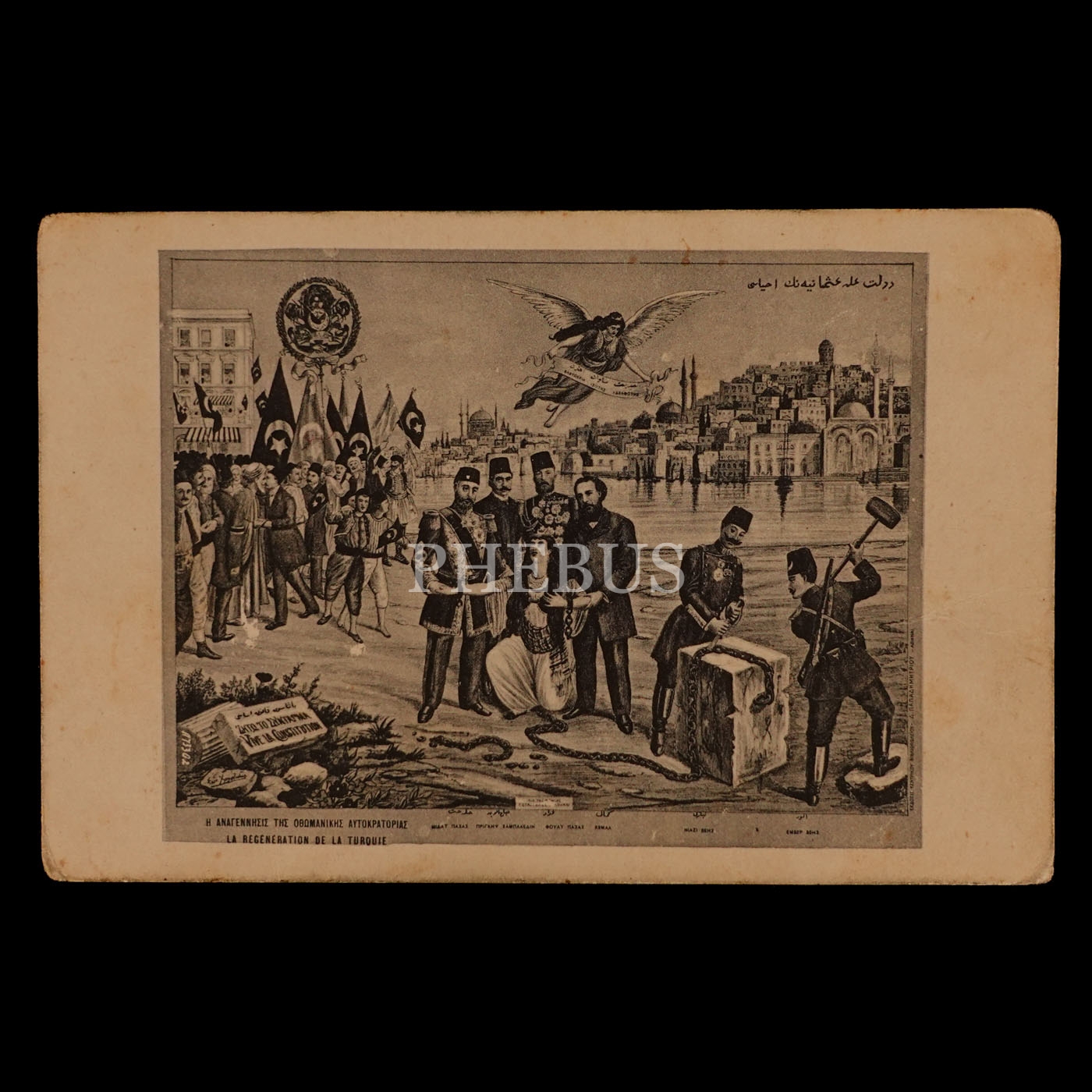 II. Meşrutiyet’in İlanı (24 Temmuz 1908) sonucunda yeniden yürürlüğe giren Kanun-ı Esasi konulu, "Devlet-i Aliyye-i Osmaniyye´nin ihyası" başlıklı kartpostal, 14x9 cm...