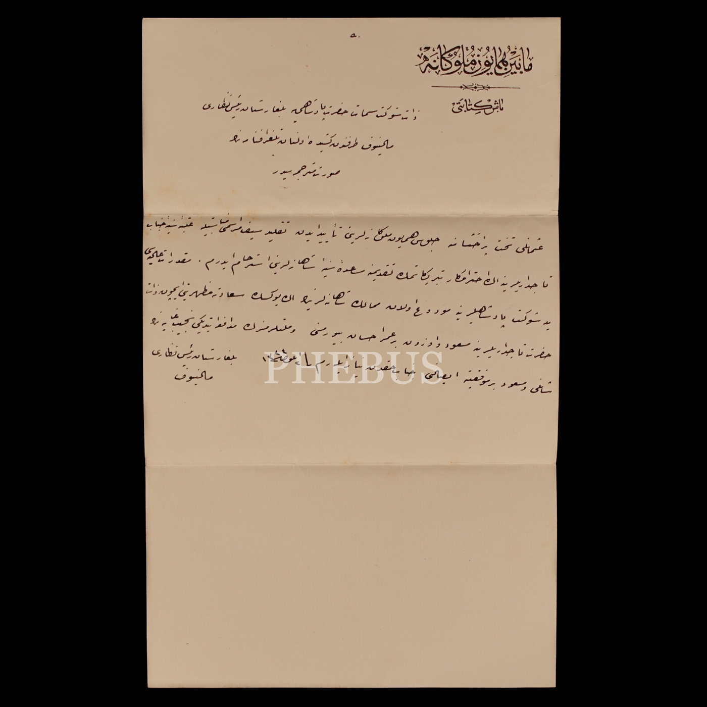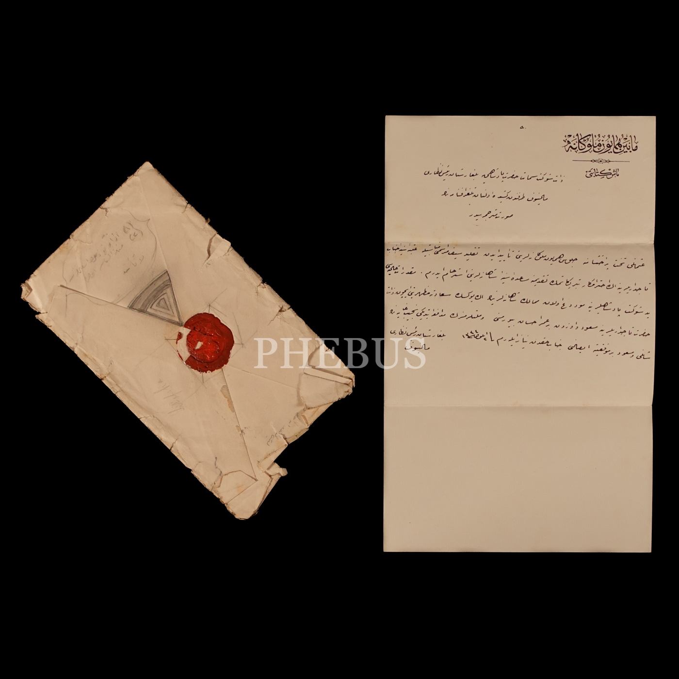 Mabeyn-i Hümayun Mülükane Baş Kitabeti antetli, Bulgaristan Reis-i Nüzzarı Malinof´un, Sultan Vahdettin´in Kılıç Alayı merasimini kutlamak maksadıyla gönderdiği telgrafın tercümesi, mühürlü zarfı içinde, 2 Eylül 1334 (2 Eylül 1918), 27x17 cm...