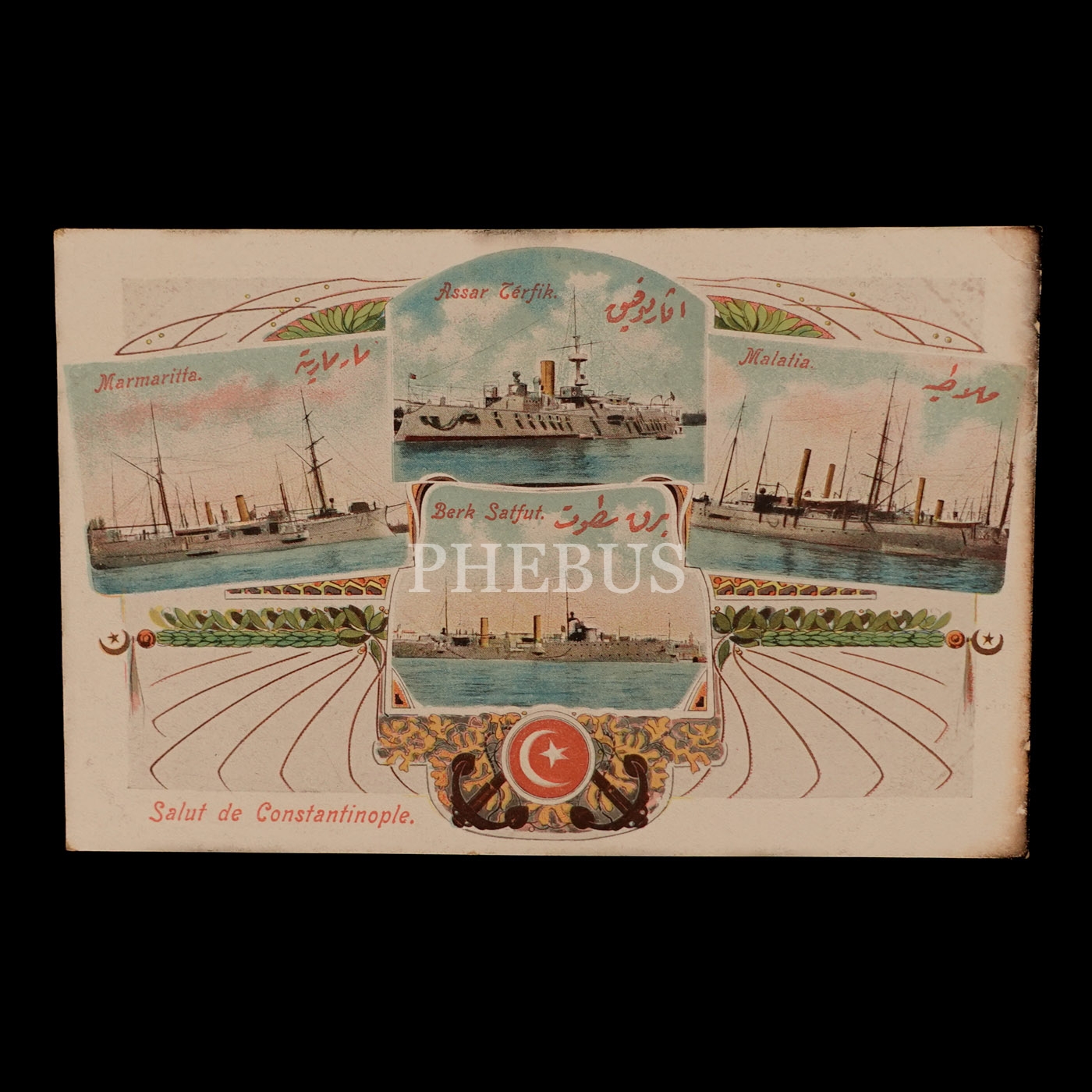 Osmanlı Donanması´na dahil Asar-ı Tevfik, Berk-i Satvet, Malatya ve Marmarita savaş gemilerinin görsellerini içeren parçalı kartpostal, "Salut de Constantinople", ed. M.J.C., 14x9 cm...