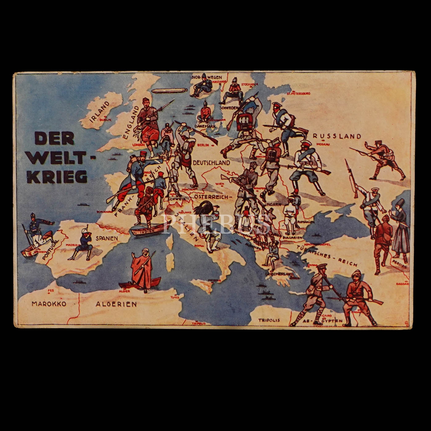 Birinci Dünya Savaşı´nda birbirine giren Avrupa temalı kartpostal, "Der Welt-Krieg", ed. K. Essig - Basel, 14x9 cm...