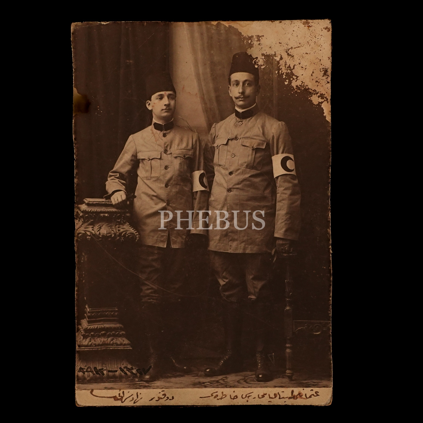 Teşkilat-ı Mahsusa´nın başkanlarından Süleyman Askeri´nin özel doktoru Nihad Sezai (Güran) ´nin, gönüllü olarak katıldığı Trablusgarp Savaşı´nda sıhhıyeci arkadaşıyla beraber üniformaları ile aldırdıkları imzalı fotoğrafı, "Osmanlı İtalya Muharebesi Hatırası", 1912, 10x15 cm...