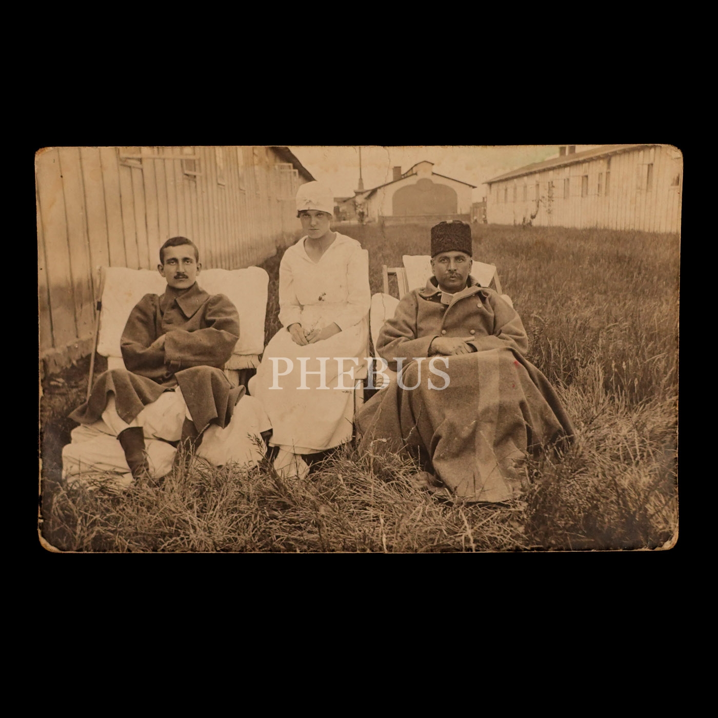 Kendilerini tedavi eden hemşireyle hatıra fotoğrafı çektiren yaralı Türk askerleri, 14x9 cm...