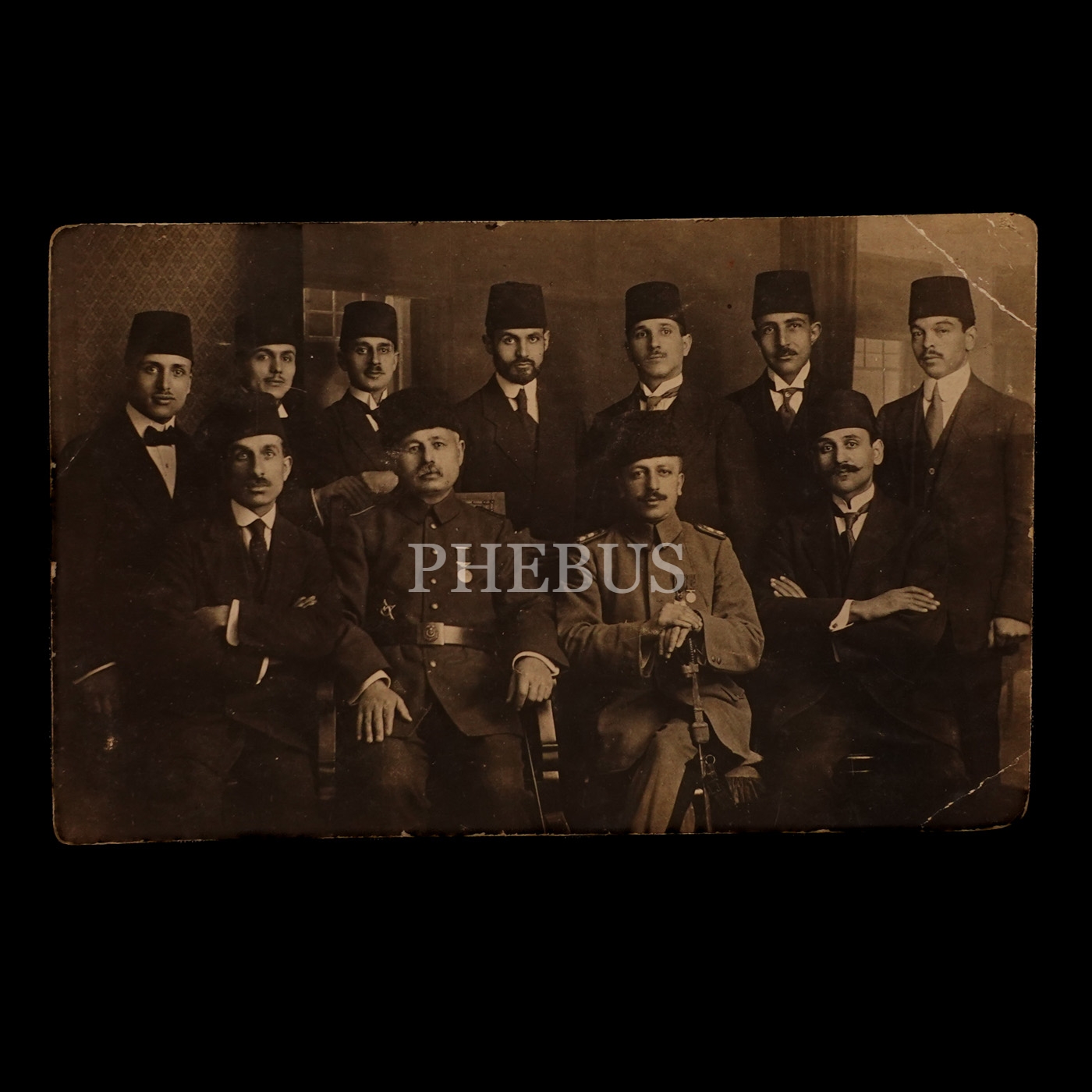 İki Osmanlı subayı ile sivil giyimli beyefendiler toplu hatıra fotoğrafı, 14x9 cm...
