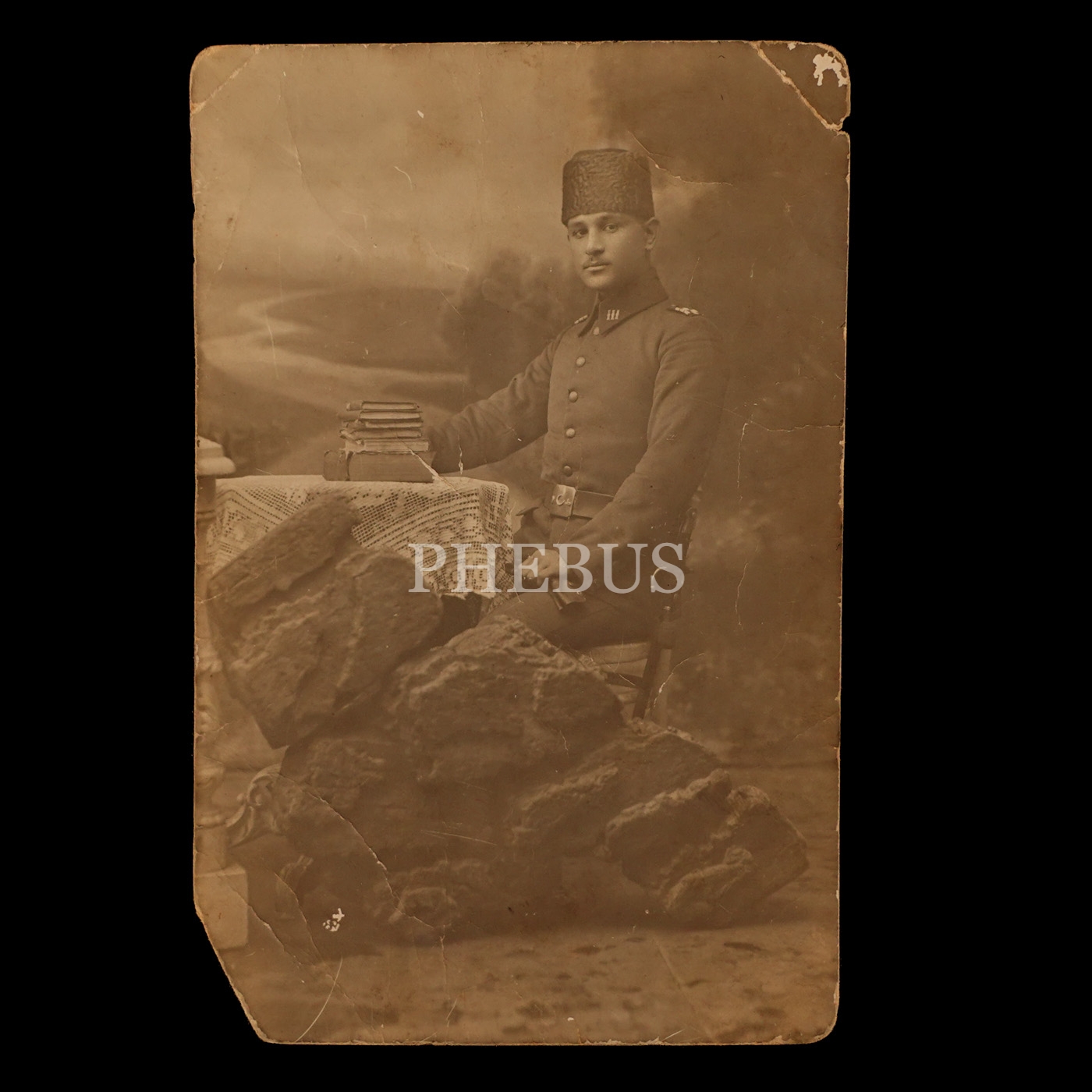 Önünde kitaplar ile poz veren üniformalı Osmanlı subayının stüdyo hatıra fotoğrafı, 2 Kanunievvel 1331, 14x9 cm...