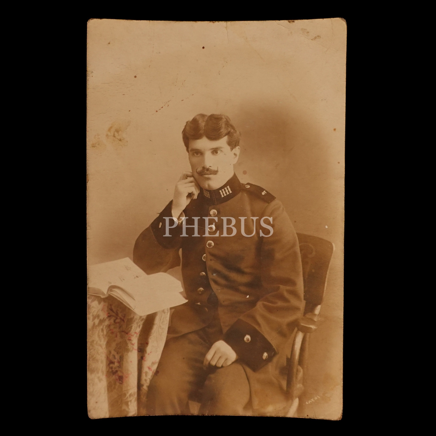 Önünde kitap ile poz veren Wilhelm bıyıklı Osmanlı subayının stüdyo hatıra fotoğrafı, 9x14 cm...