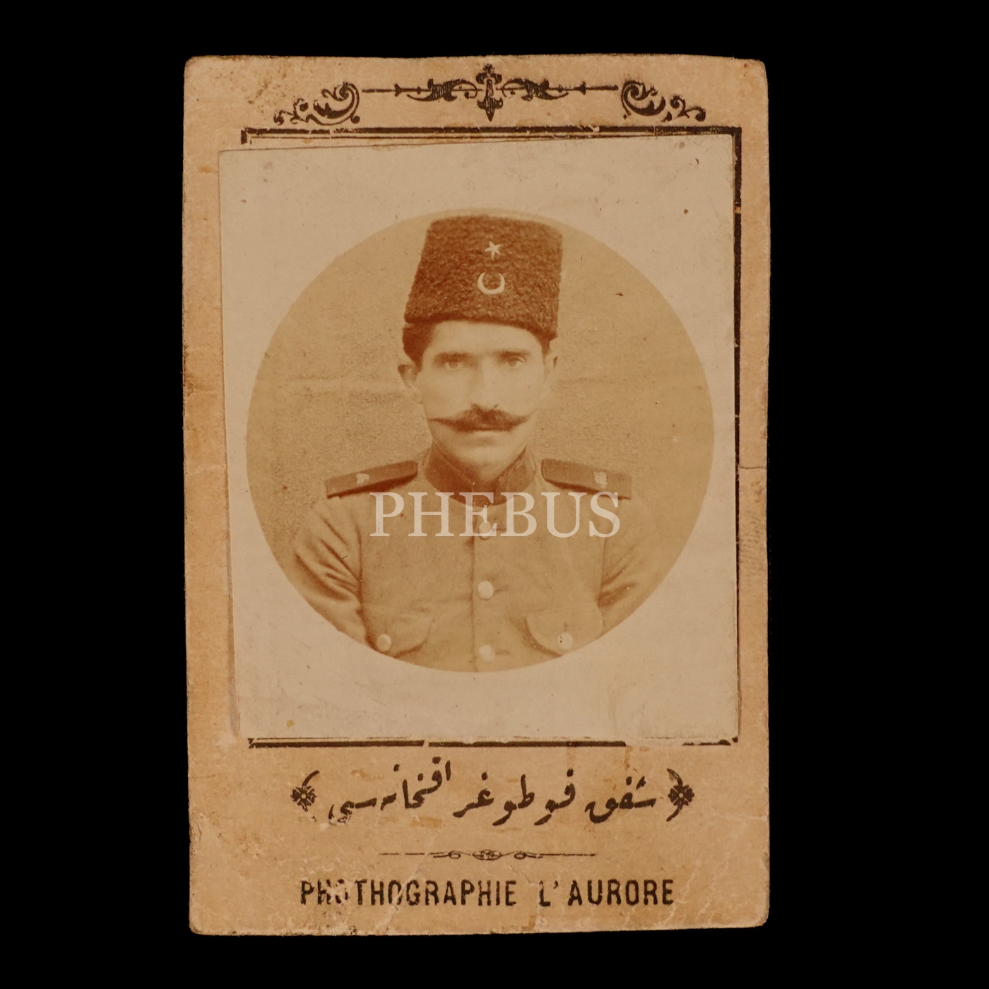 Üniformalı Osmanlı subayının kartvizit boy (CDV) stüdyo hatıra fotoğrafı, Şafak Fotoğrafhanesi, 6x10 cm...