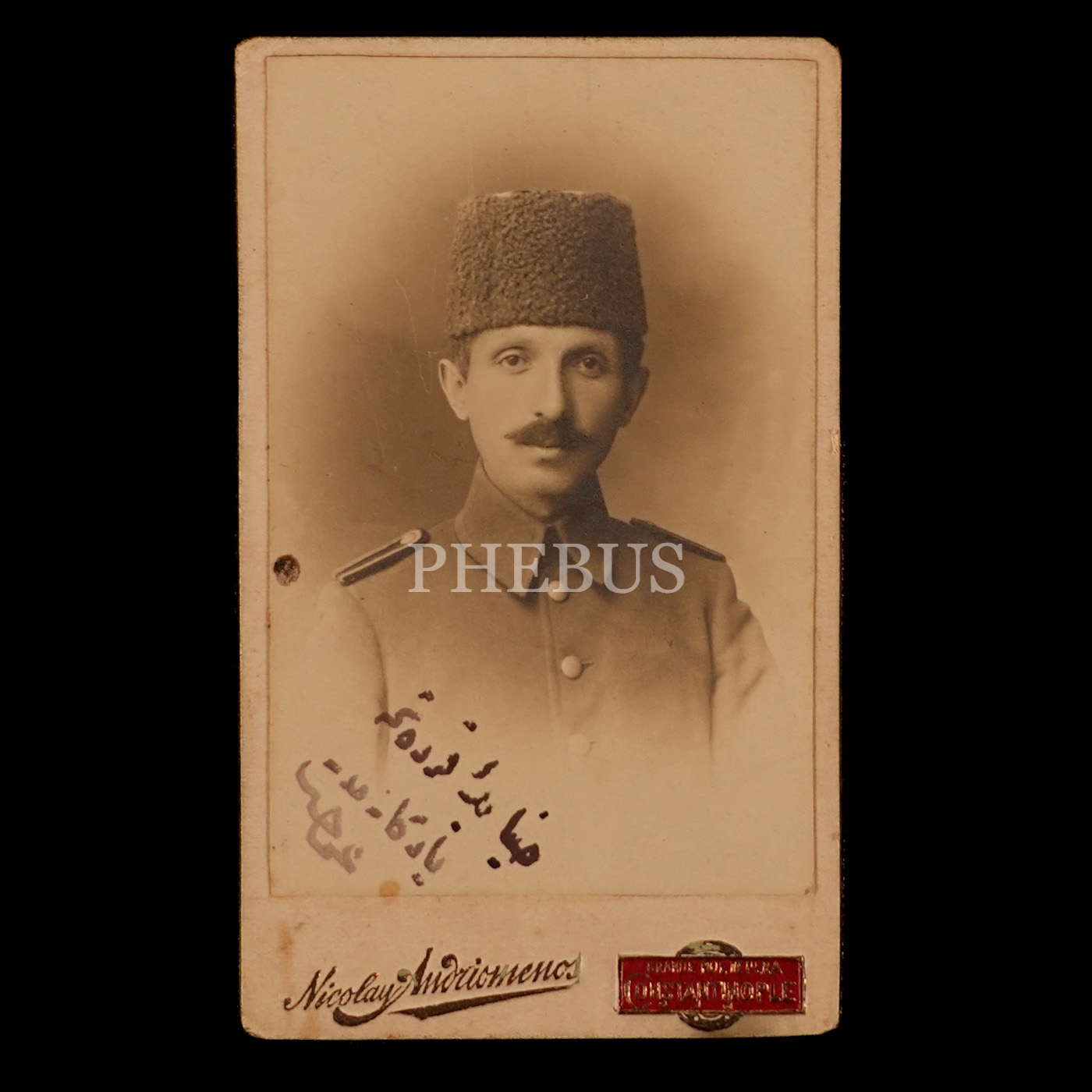 Üniformalı Osmanlı subayının kartvizit boy (CDV) stüdyo hatıra fotoğrafı, Nicolas Andriomenos Fotoğrafhanesi, 5x8 cm...