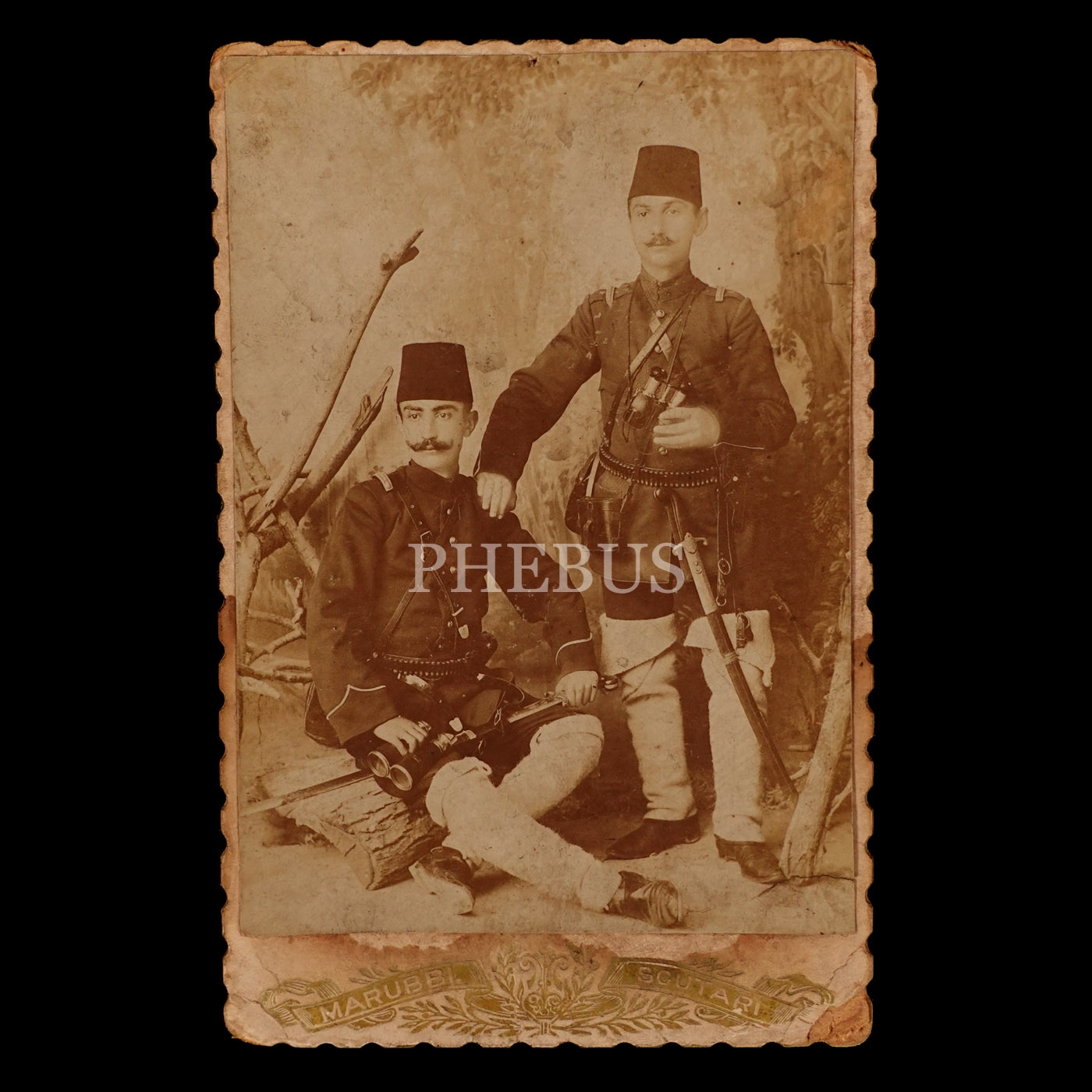 Osmanlı subaylarının tam techizat üniformalarıyla aldırdığı stüdyo hatıra fotoğrafı, Üsküdar Marubbi Fotoğrafhanesi, 11x17 cm...