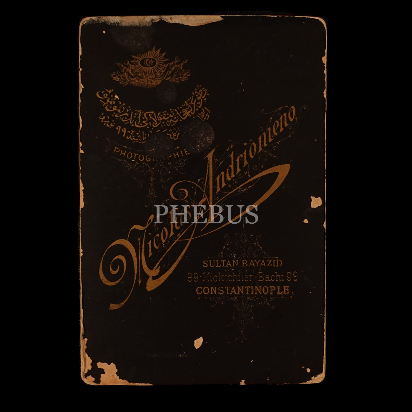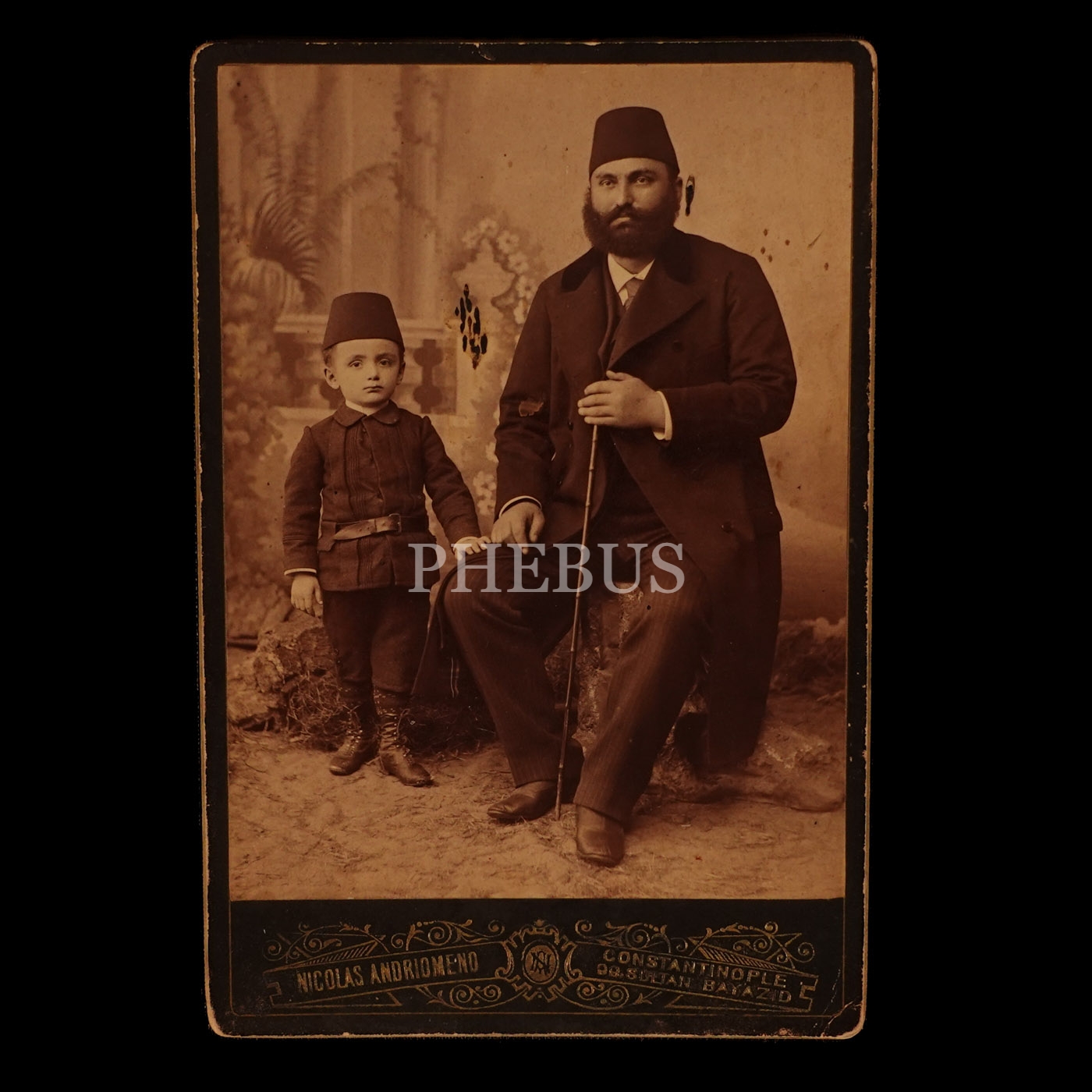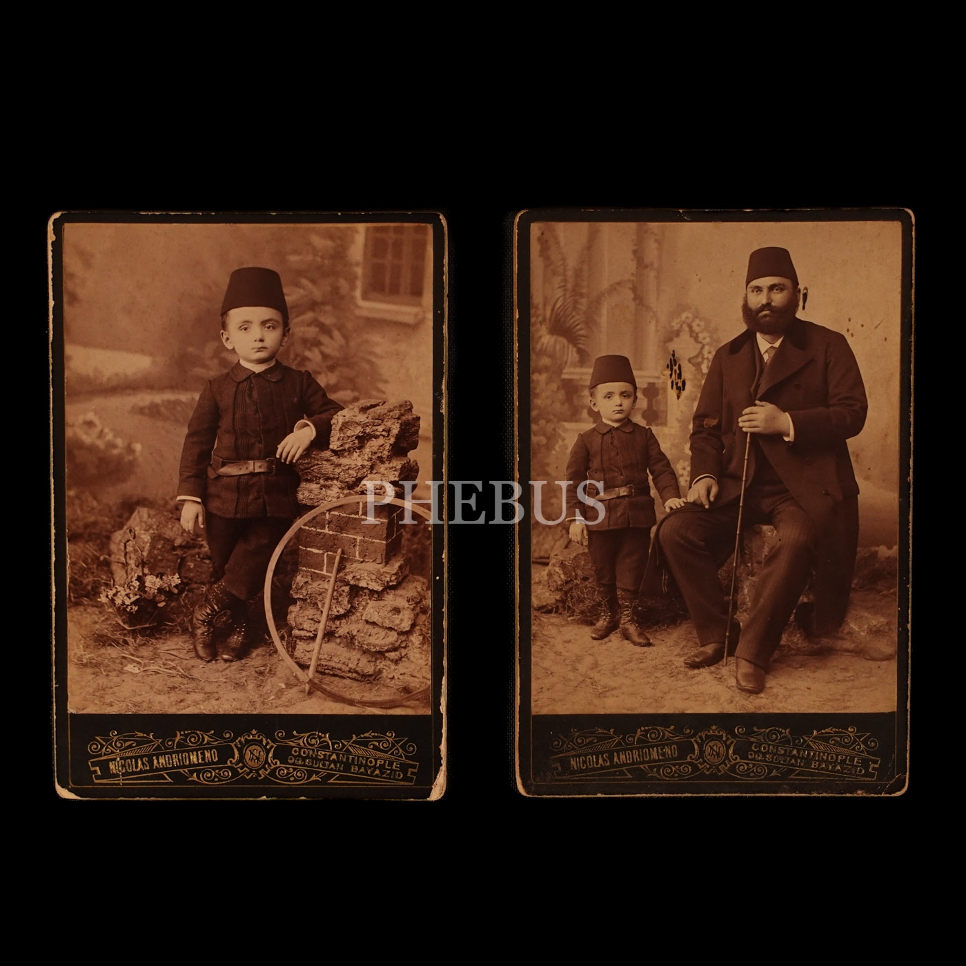 Bir baba ile oğlunun Nicolas Andriomenos fotoğrafhanesinde birlikte ve müstakil aldırdıkları stüdyo hatıra kabin fotoğrafları (3 adet), 11x17 cm...