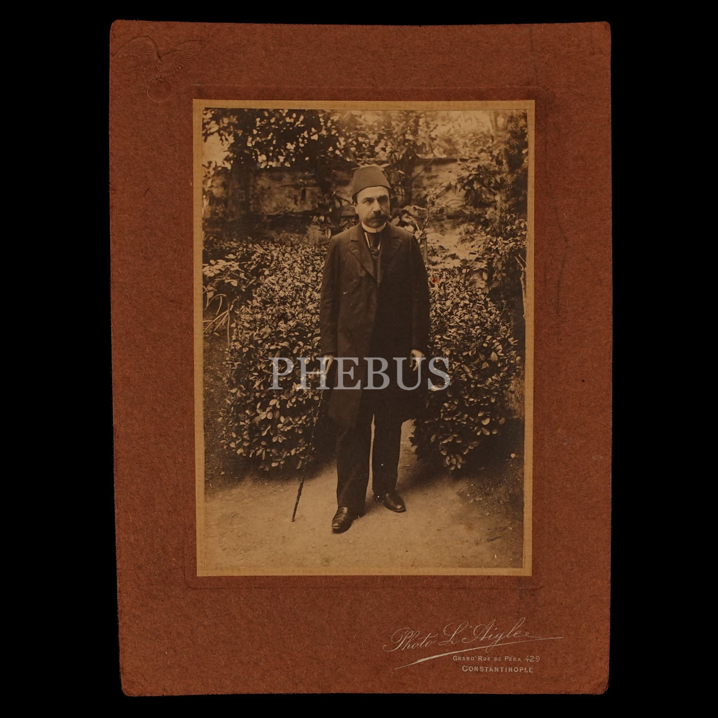 Şık giyimli, bastonlu bir beyefendinin hatıra fotoğrafı, Photo l´Aigle - Constantinople, paspartusuyla birlikte 17x23 cm...