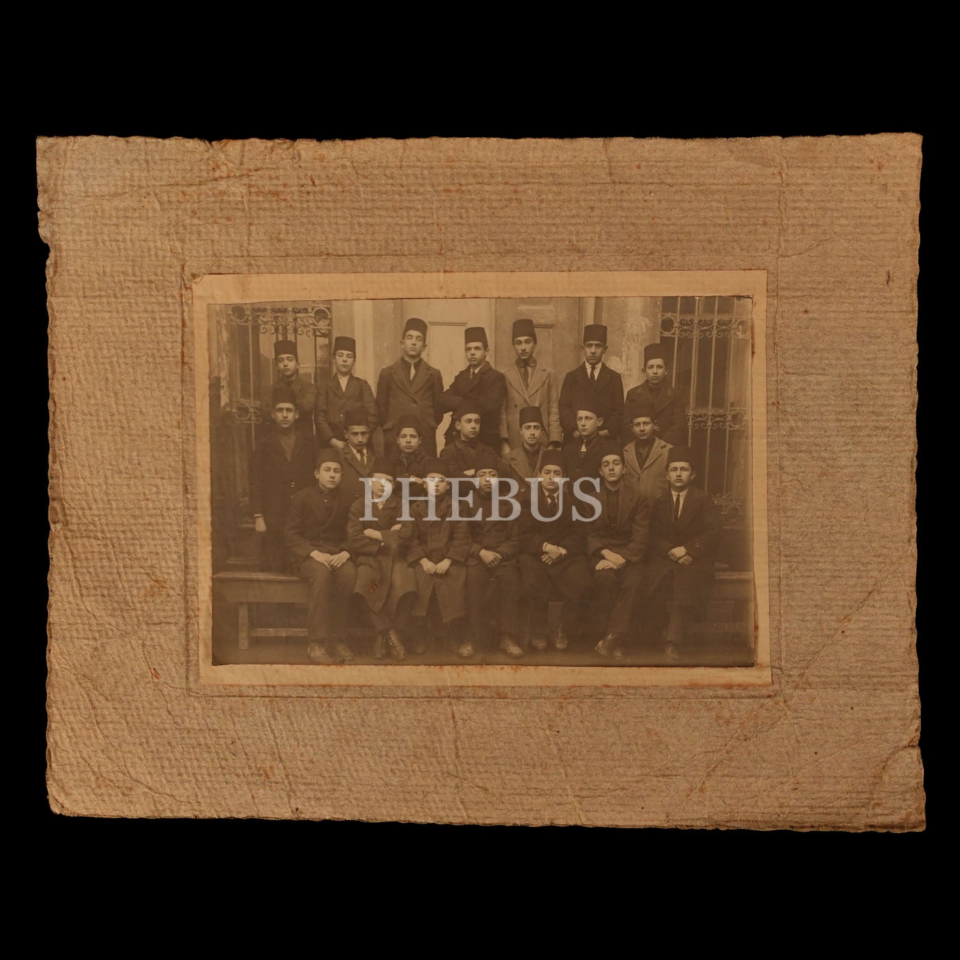 Okulları önünde toplu hatıra fotoğrafı çektiren mektepliler, bez paspartusuyla birlikte 27x21 cm...