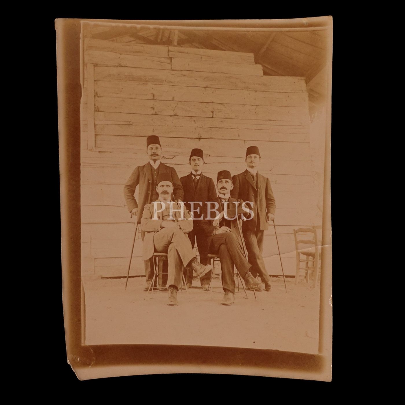 Ahşap bir yapı önünde toplu hatıra fotoğrafı çektiren beyefendiler, 9x12 cm...