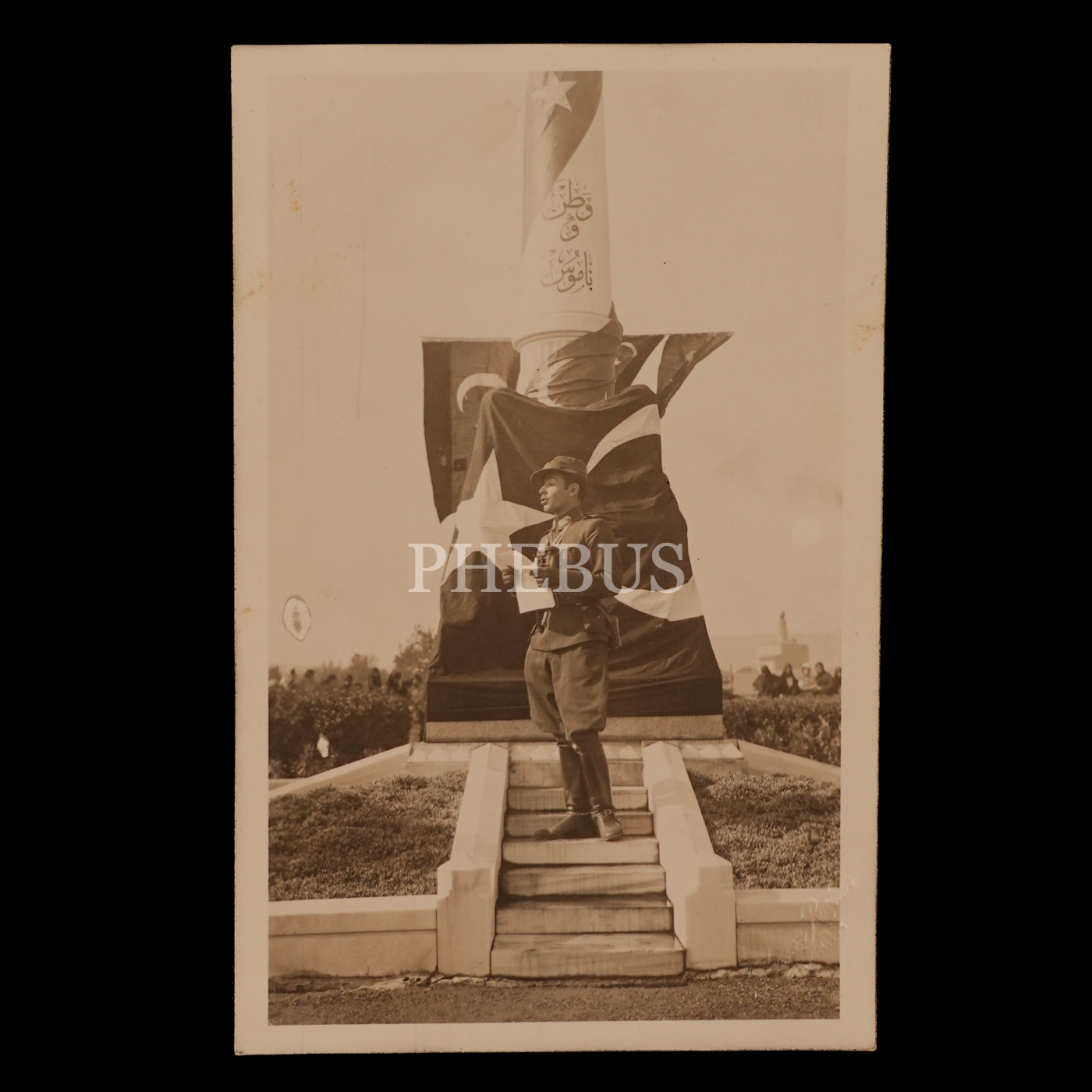"Vatan ve Namus" yazılı, İzmir Halkapınar Dokuz Eylül Şehitlik Anıtı önünde konuşma yapan subayın hatıra fotoğrafı, 14x9 cm...