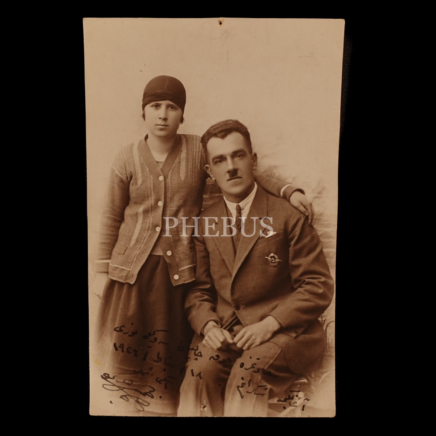 Erken Cumhuriyet döneminden, havacı bröveli beyefendinin eşiyle aldırdığı hatıra fotoğrafı, 1926, 9x14 cm...