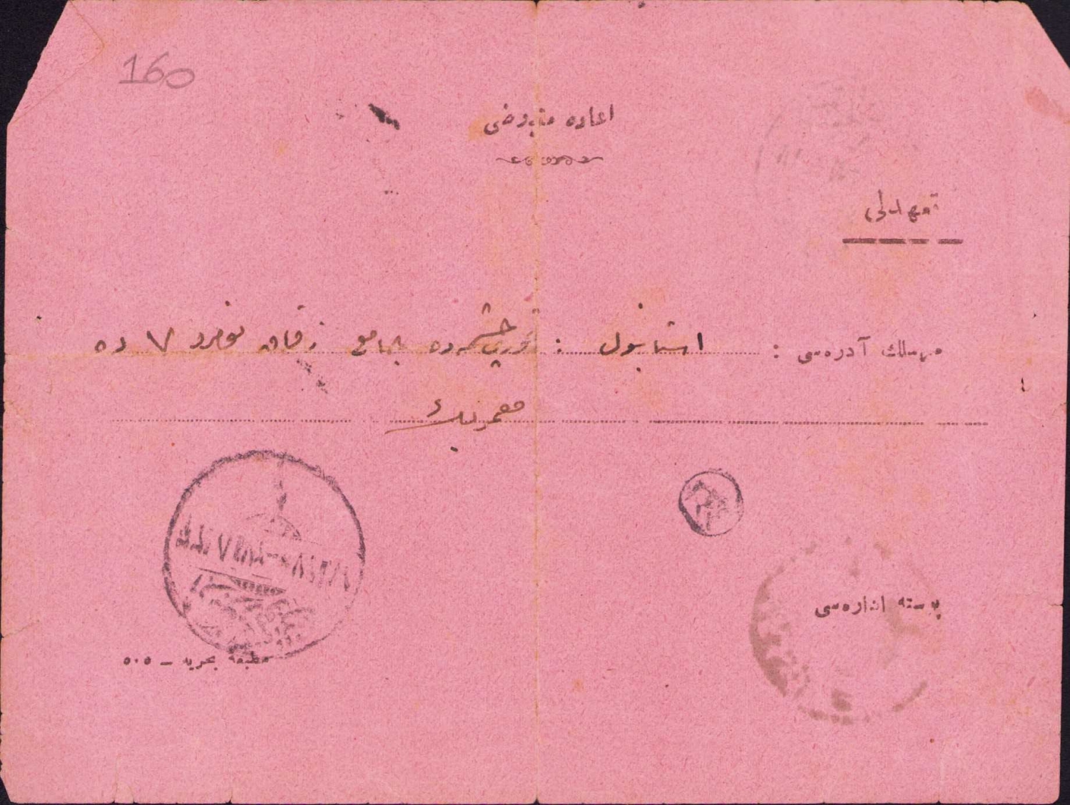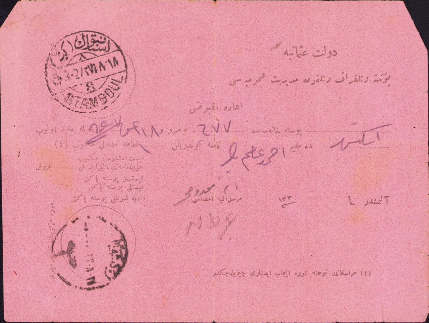 Devleti Osmaniye posta ve telgraf ve telefon müdiryeti umumiyesi iade makbuzu, 15x10 cm