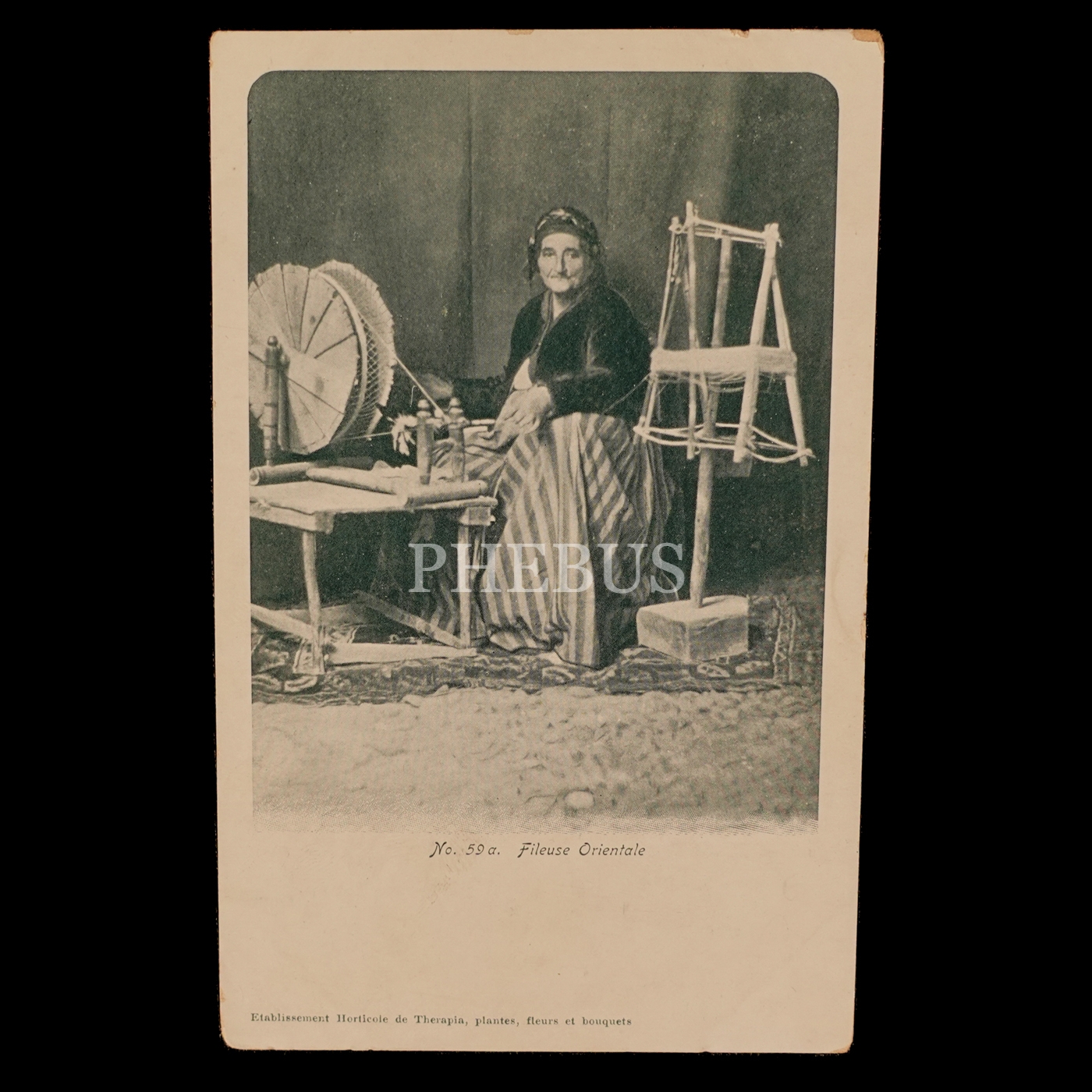 Çıkrığı bir başında yaşlı bir Doğulu kadın, ed. Etablissement Horticole de Therapia, plantes, fleurs et bouquets, 9x14 cm...