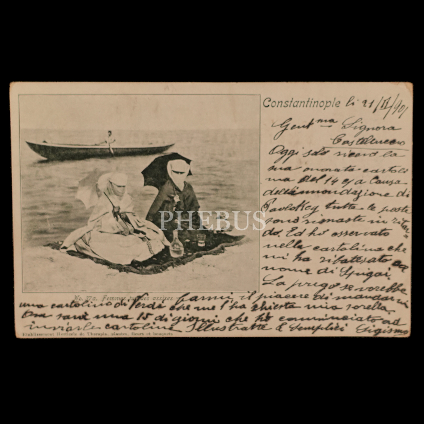 Mesire alanında Türk kadınları, "Constantinople - Femmes turques assises", ed. Etablissement Horticole de Therapia, plantes, fleurs et bouquets", 14x9 cm...