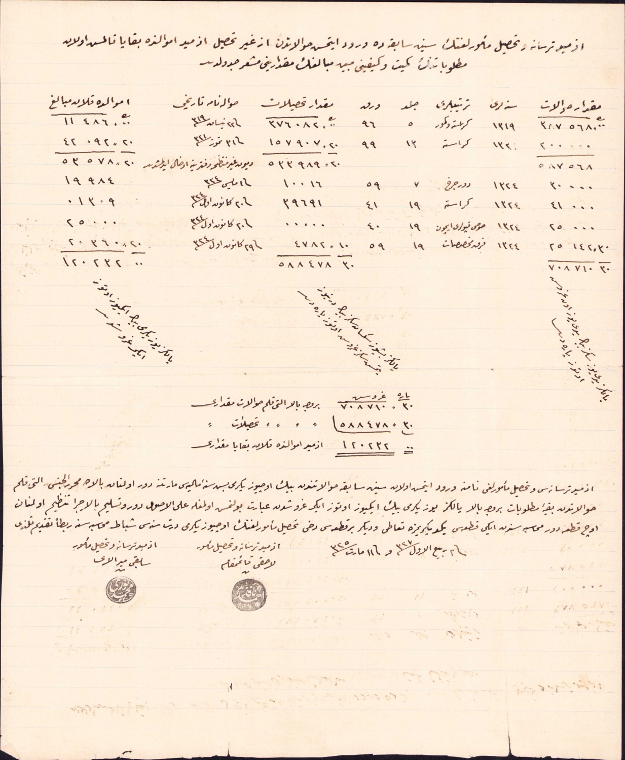 Osmanlıca İzmir tersane tahsil memurluğuna ait muhasebe kaydı, 1325, 26x32 cm