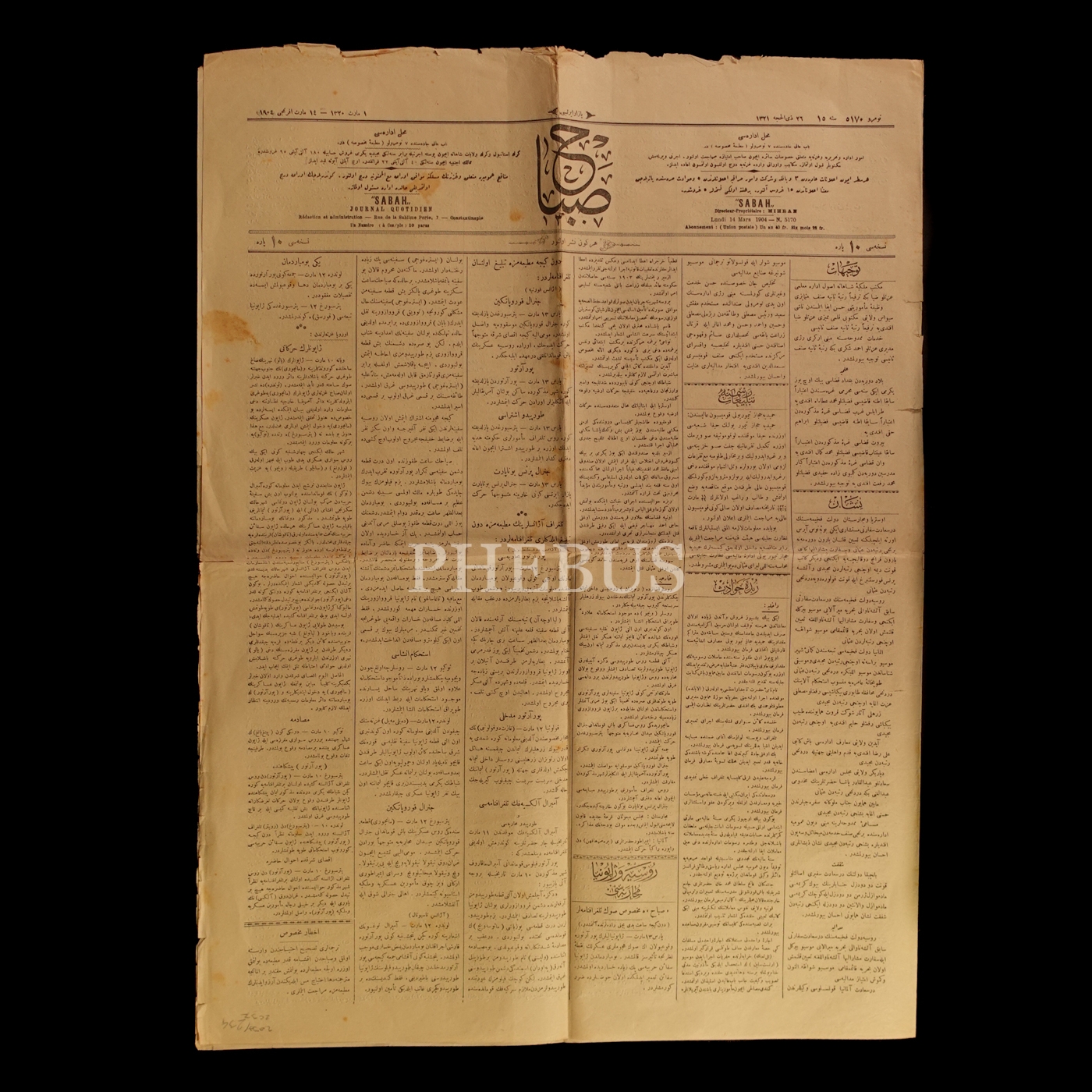 SABAH gazetesinin 26 Zilhicce 1321 tarihli nüshası, 47x65 cm...
