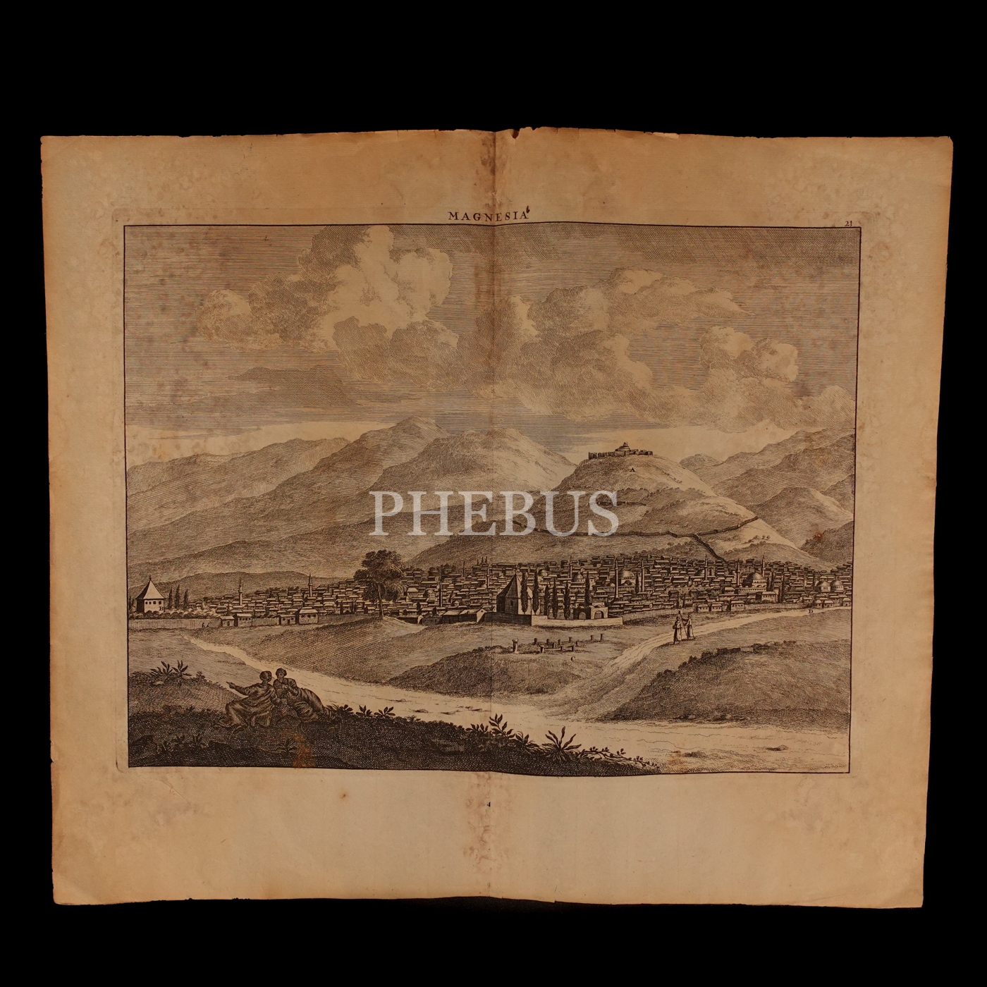 Hollandalı gezgin Cornelis de Bruyn´un (1652-1727), 1678 yılında çıktığı ve 1684 yılında tamamladığı Osmanlı İmparatorluğu ve çevresini kapsayan 6 yıllık İstanbul, Küçük Asya, Kariye, Rodos, Mısır, Suriye ve Kutsal Topraklar seyahati gözlemlerini, harikulade gravürlerle yansıtan meşhur seyahatnamesinden çıkma nadir bir Manisa manzarası.