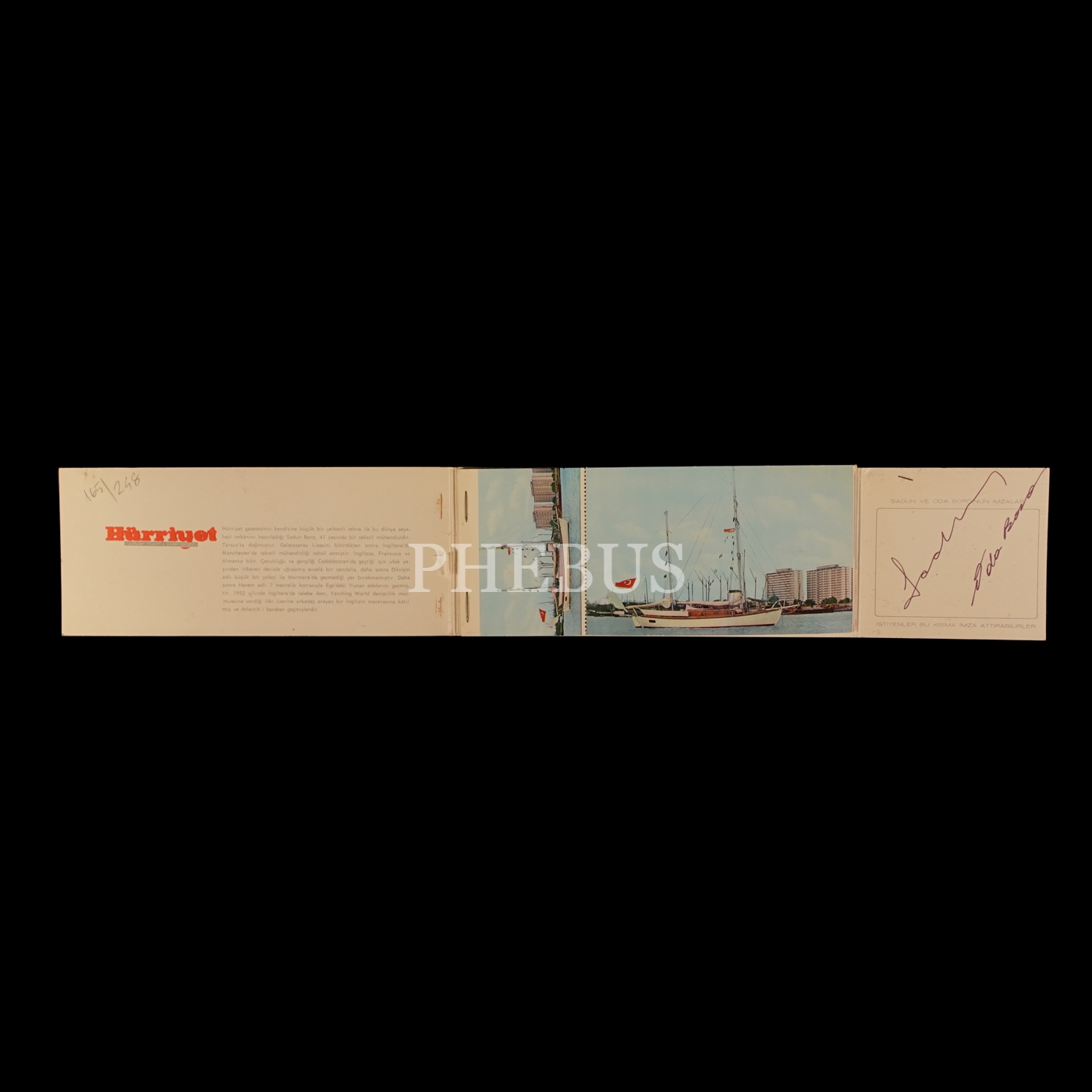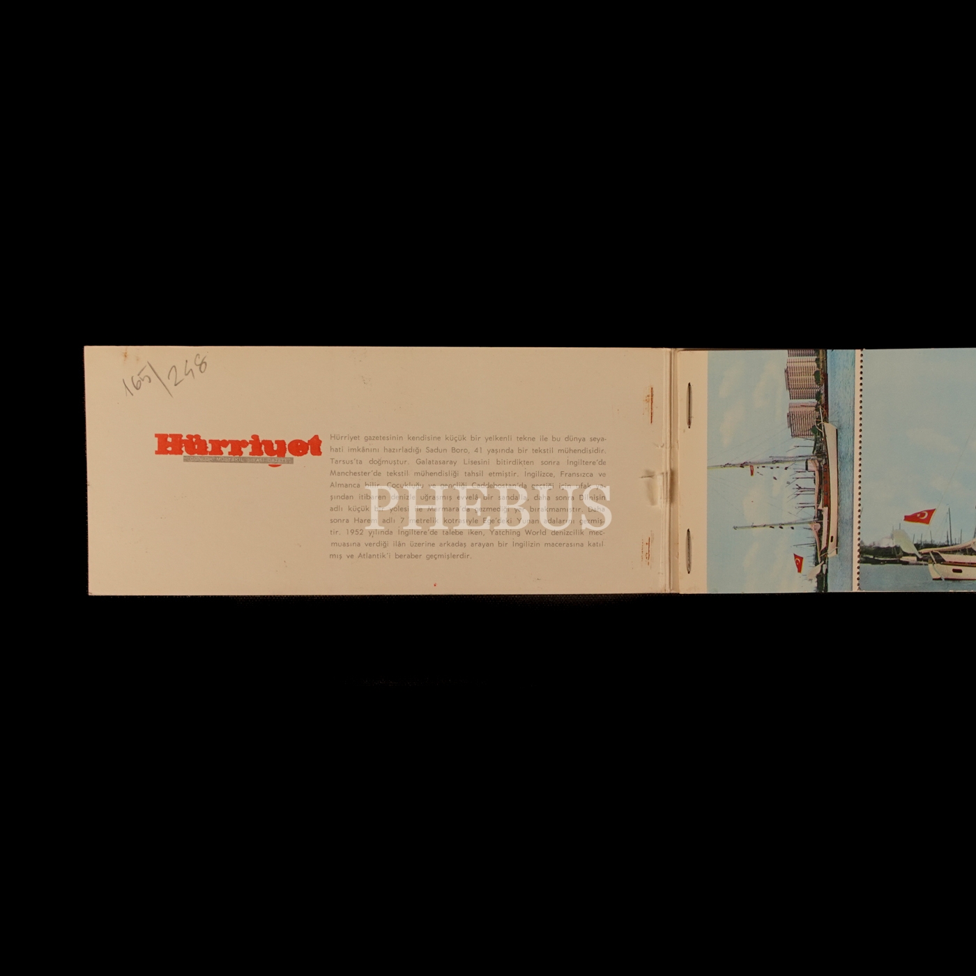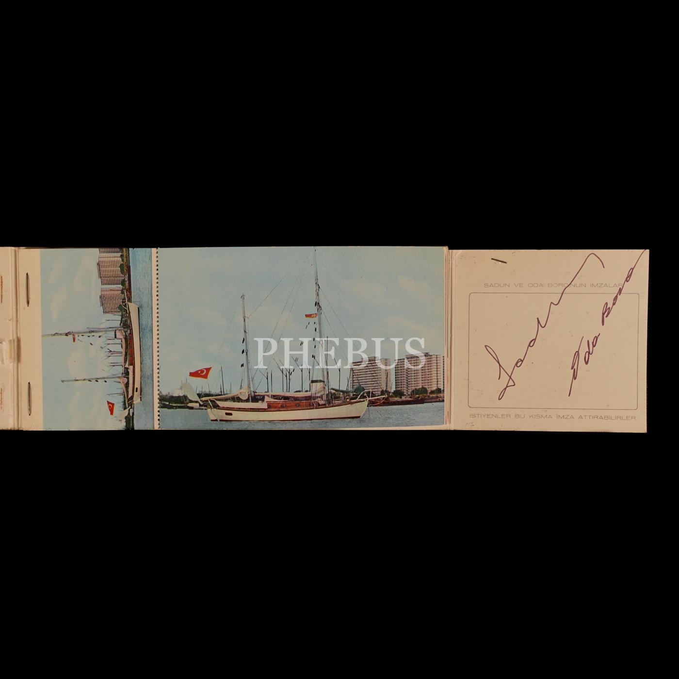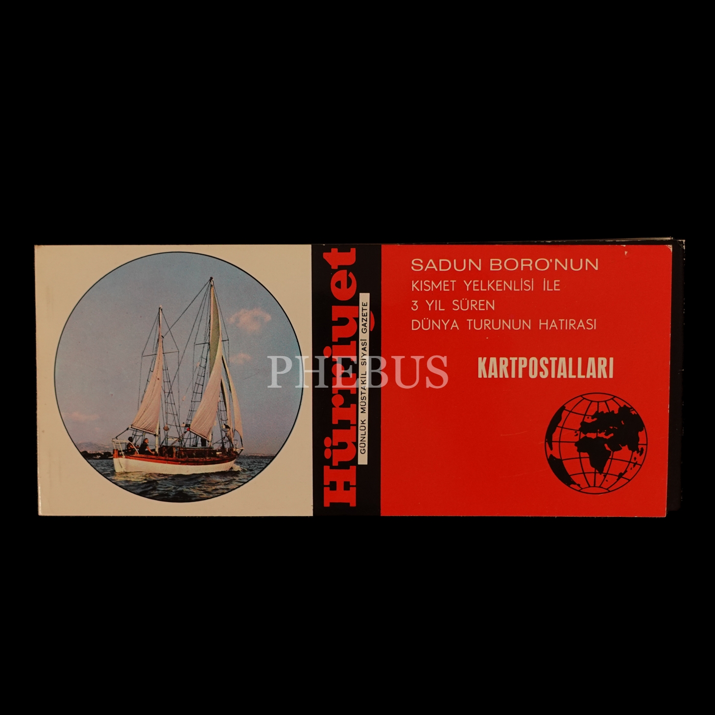 Sadun ve Oda Boro çiftinin ıslak imzaları ile Hürriyet gazetesi tarafından yayımlanan "Sadun Boro´nun Kısmet Yelkenlisi ile 3 yıl süren Dünya Turunun kartpostalları" albümü, 20x8 cm...