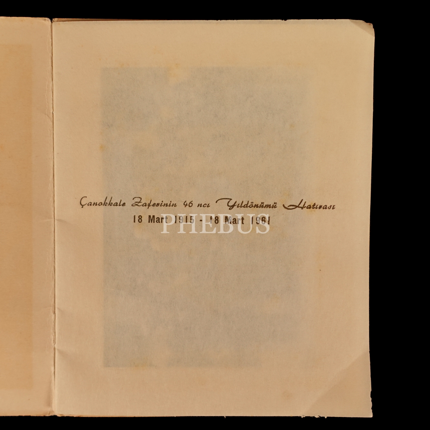 "Çanakkale Zaferinin 46 ncı Yıldönümü Hatırası (18 Mart 1915 - 18 Mart 1961)" başlıklı, üç fotoğraflı hatıra albümü, 12x15 cm...
