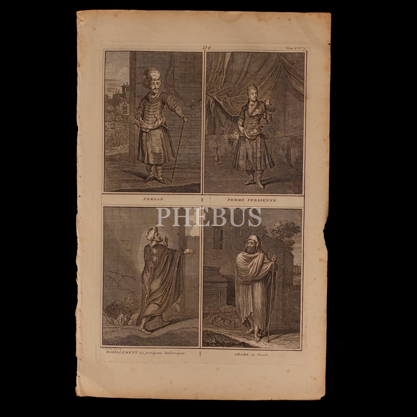 Pers erkeği, Pers kadını, geleneksel kıyafetiyle Berberi lideri, Arap, "Persan, Femme Persienne, Habillement des principaux Barbaresques, Arabe du Desert", Bernard Picart, 1729, 26x40 cm...