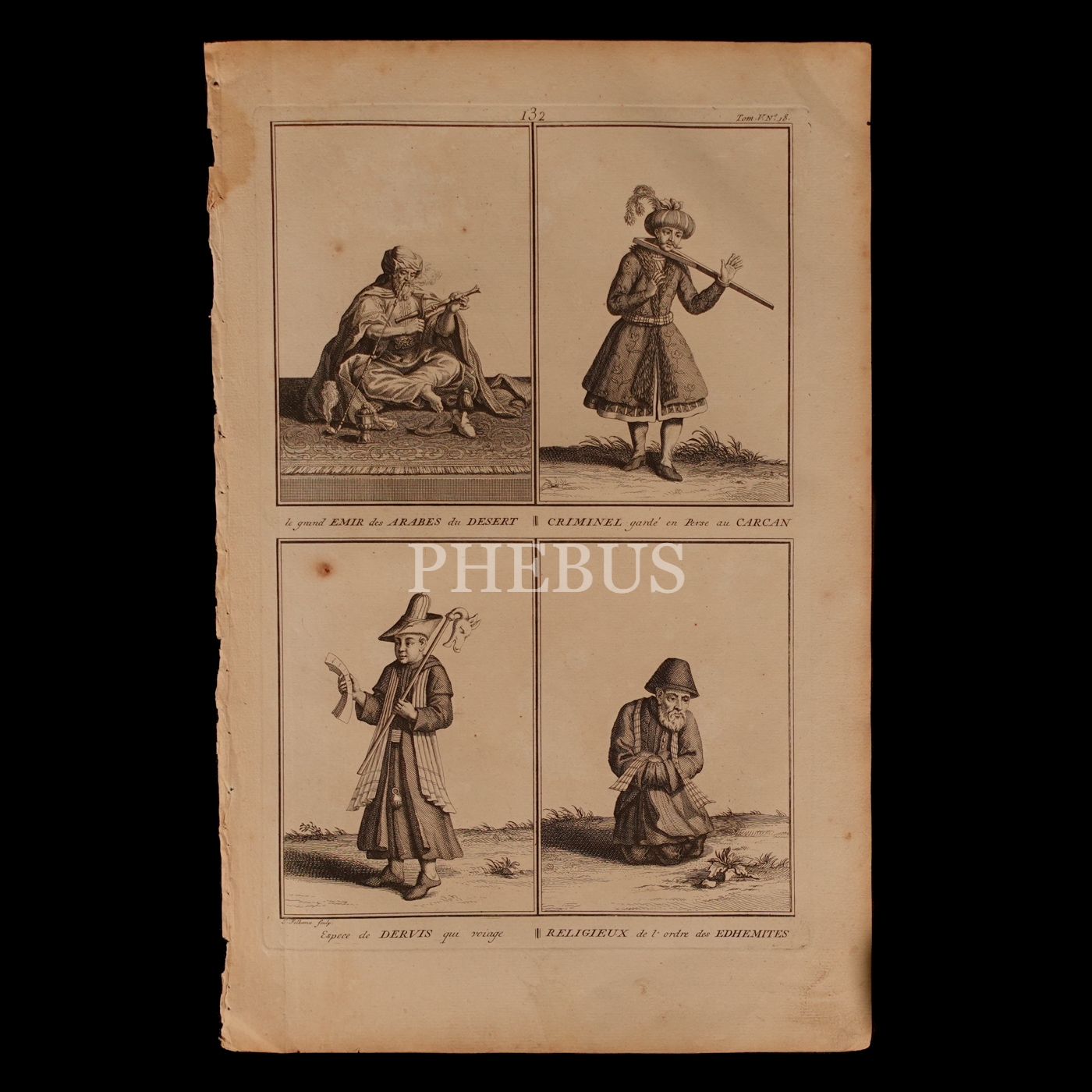 Çöl Araplarının büyük Emiri, İranlı ceza muhafızı, gezgin derviş, Edhemiyye tarikatından bir din adamı, "le grand Emir des Arabes du Desert, Criminel garde´ en Perse au Carcan, Espece de Dervis qui voiage, Religieux de l´ordre des Edhemites", Bernard Picart, 1729, 26x40 cm...
