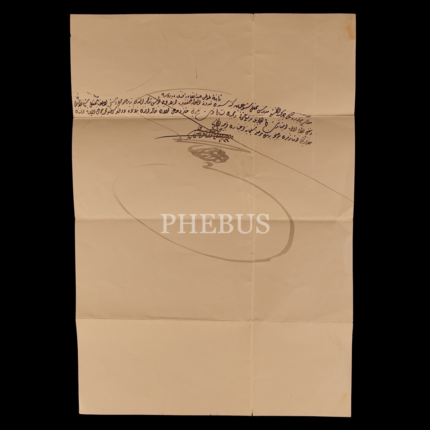 Bursa´da Tuti Abdulkadir Efendi Medresesi müderrislerinden Yusuf Şakir Efendi´nin Hareket-i Altmışlı rütbesinden Musile-i Süleymaniye rütbesine tevcih edildiğine dair rütbe terfi evrağı, 29x41 cm...