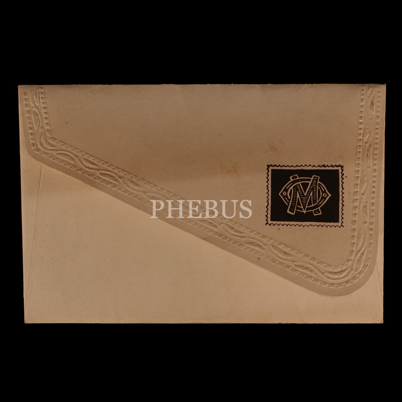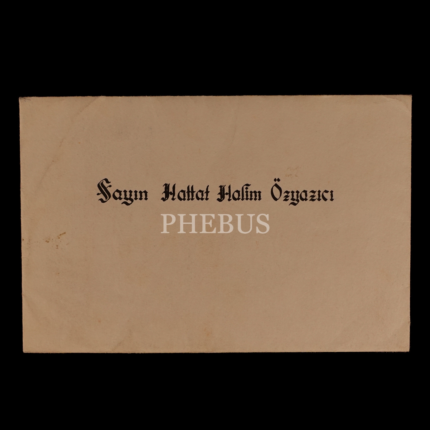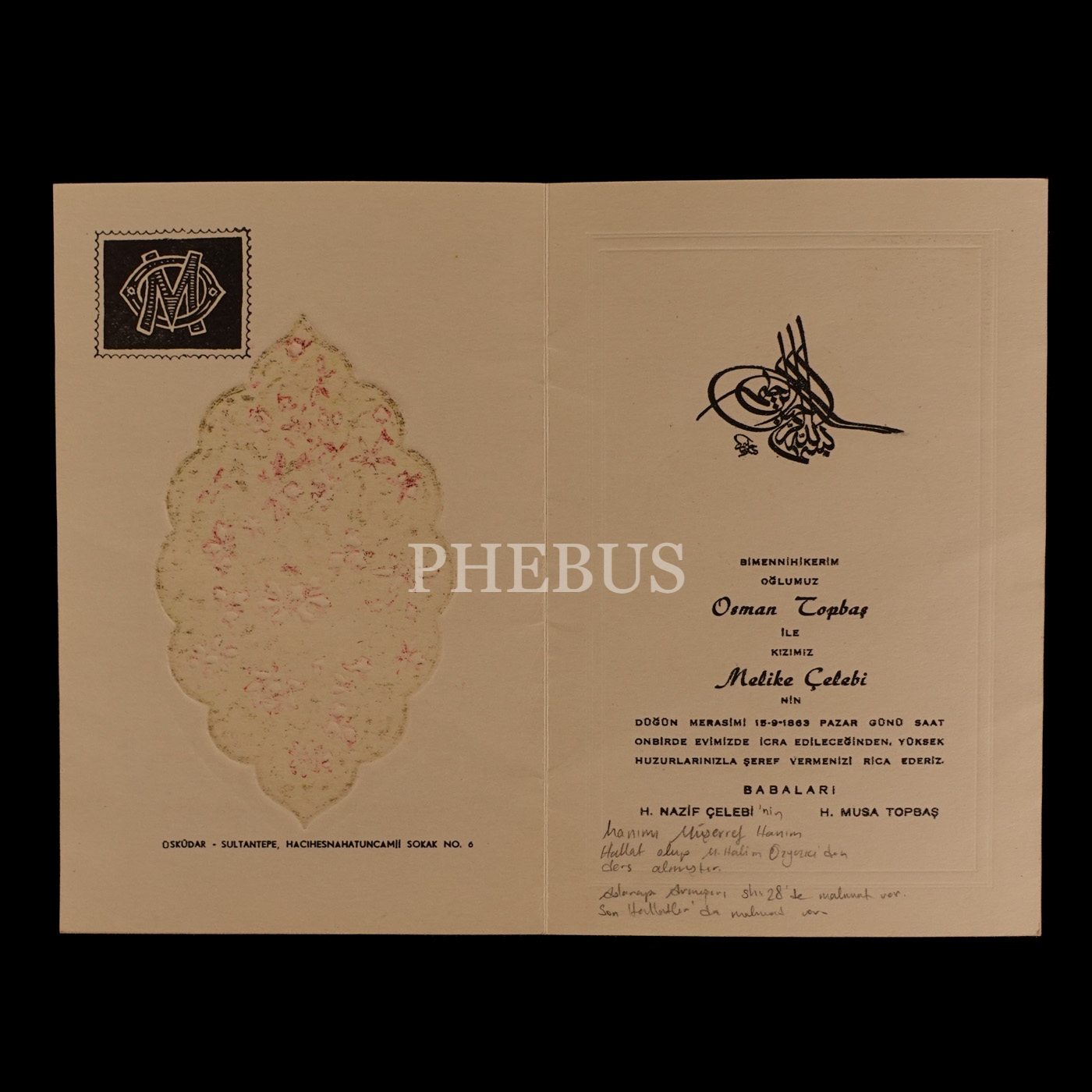 Halim Özyazıcı´nın öğrencisi Müşerref Çelebi´nin kızı Melike Çelebi´nin, Halim Özyazıcı´ya özel olarak gönderdiği düğün davetiyesi, zarf 19x23 cm, davetiye 23x18 cm...