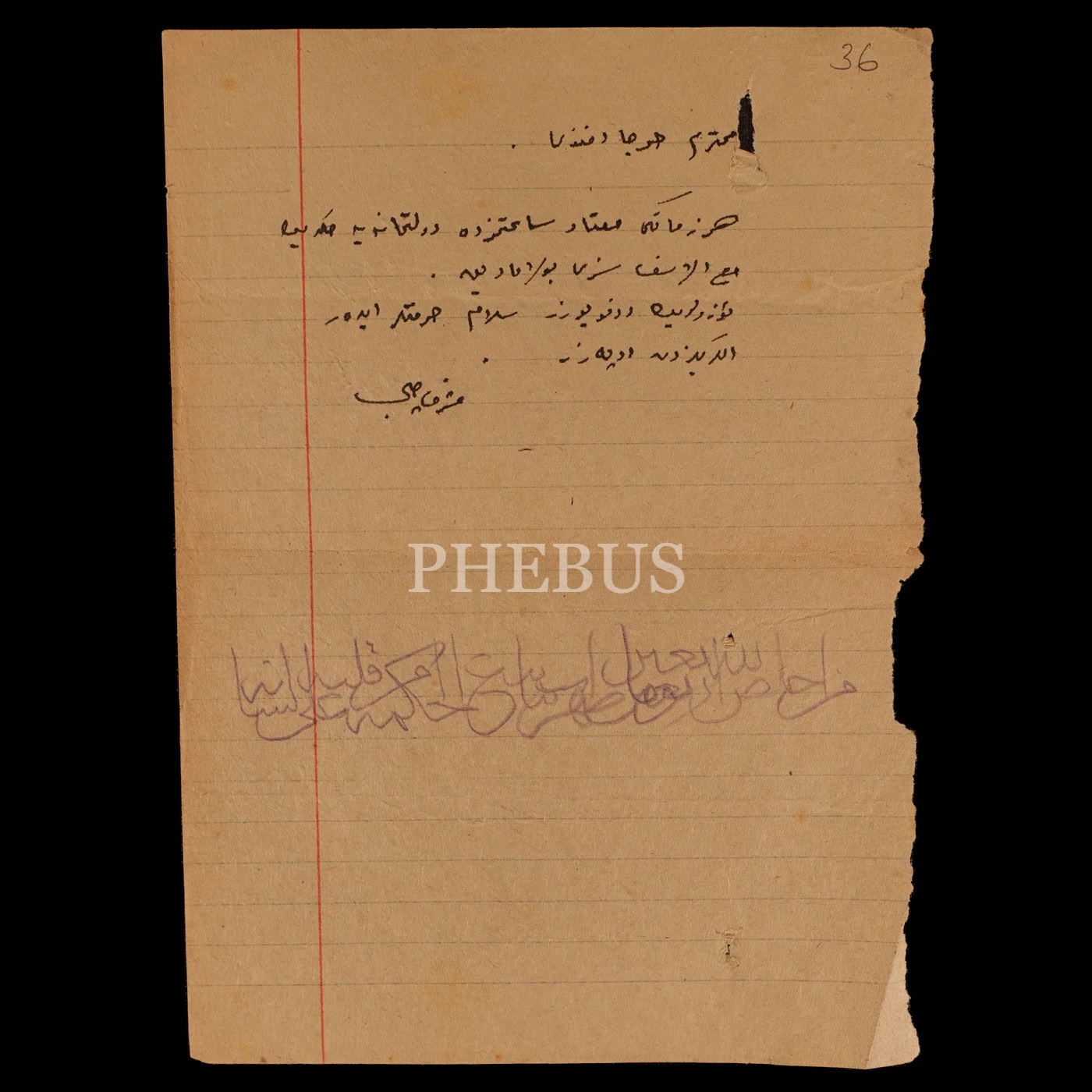 Müşerref Çelebi´nin yazısı, "Muhterem Hoca Efendi, her zamanki mu´tad saatimizde devlethaneye geldik. Maalesef sizi bulamadık. Üzüldük, dönüyoruz. Selam ve hürmetler eder llerinizden öperiz." şeklindedir. Bunun yanı sıra, kağıdın ön ve arka yüzünde hat çalışmaları mevcuttur.