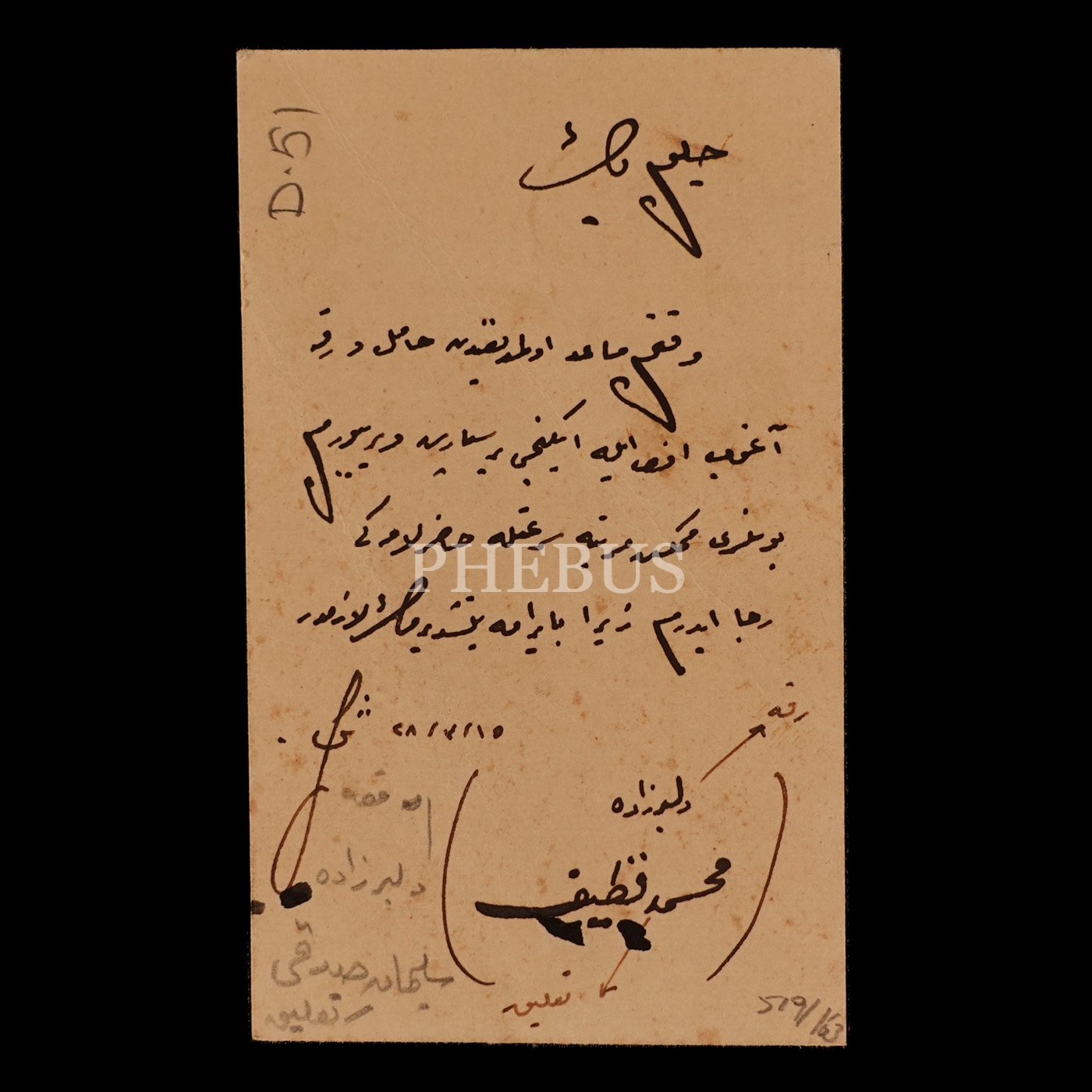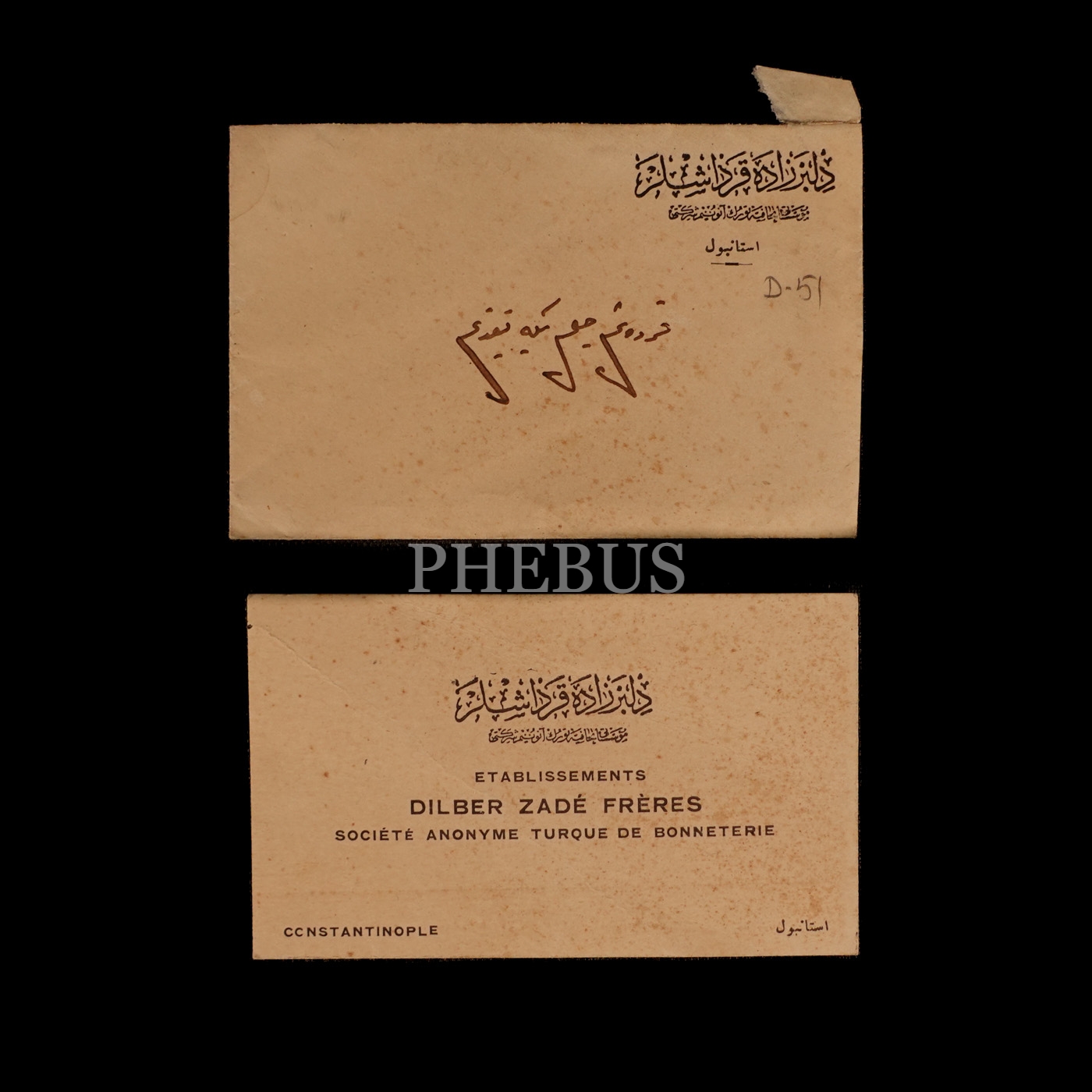 "Dilberzade Kardeşler" firmasının, Halim Özyazıcı´ya siparişininin yazılı olduğu zarf ve kartvizit, 10x6 cm...