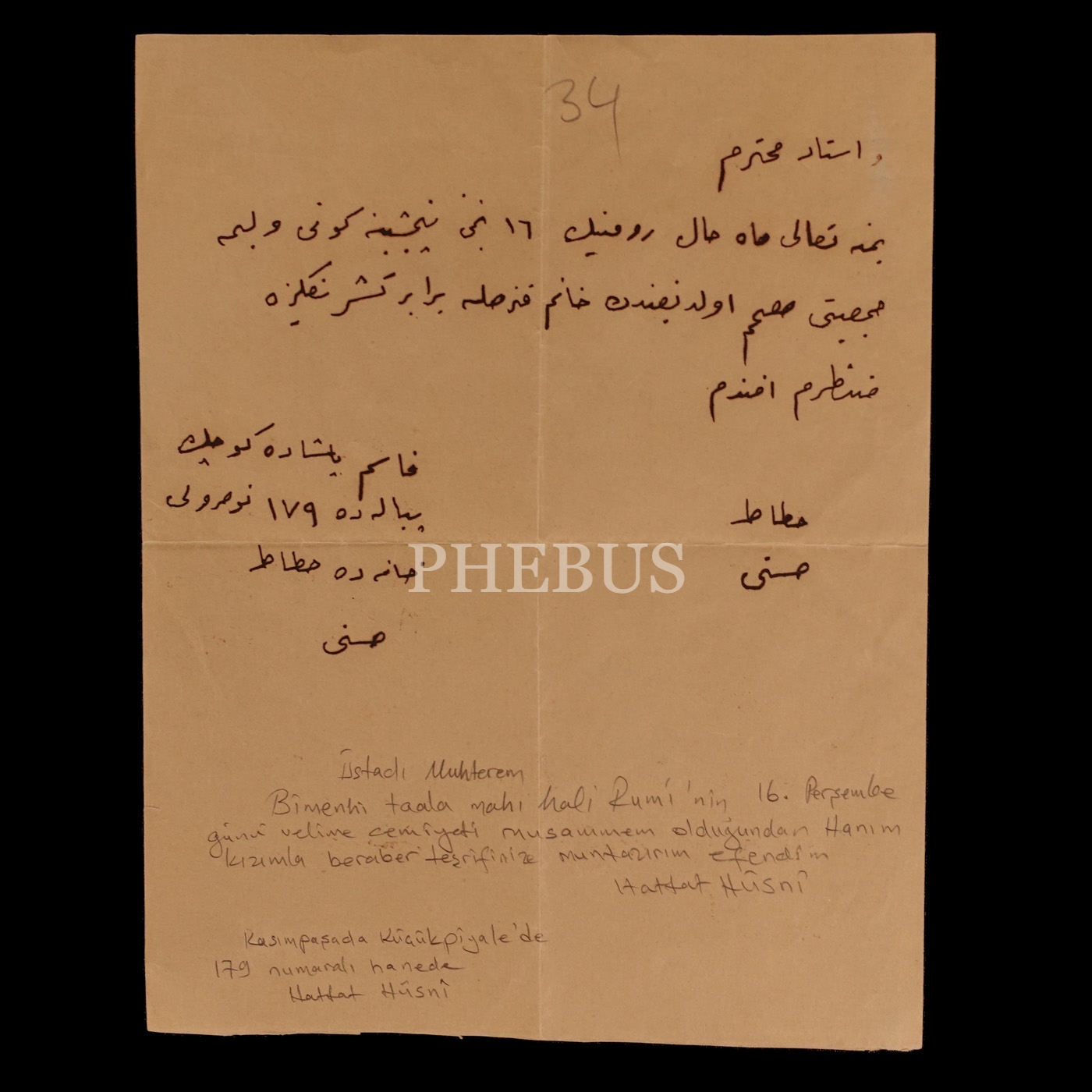 Hattat Hüsnİ Bey´in kızının düğününe Halim Özyazıcı´yı davet etmek için kaleme aldığı mektubu, 23x30 cm...