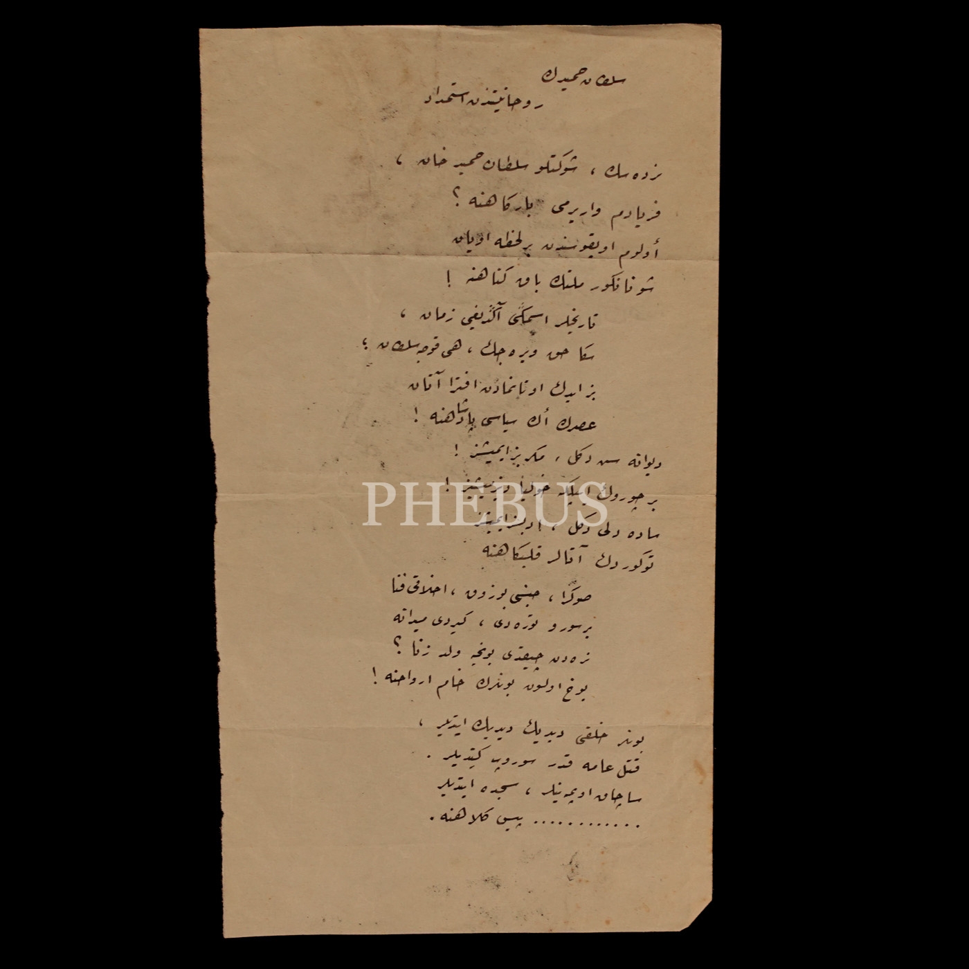 Halim Özyazıcı´nın terekesinden, Rıza Tevfik´in "Sultan Abdülhamid´in Ruhaniyetinden İstimdad" başlıklı şiirinin, rik´a yazı ile kaleme alındığı sayfa, 17x30 cm...