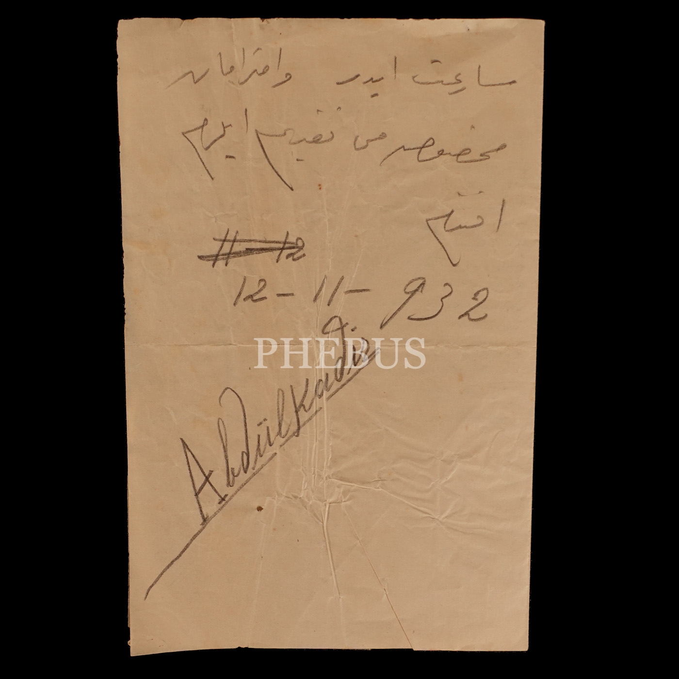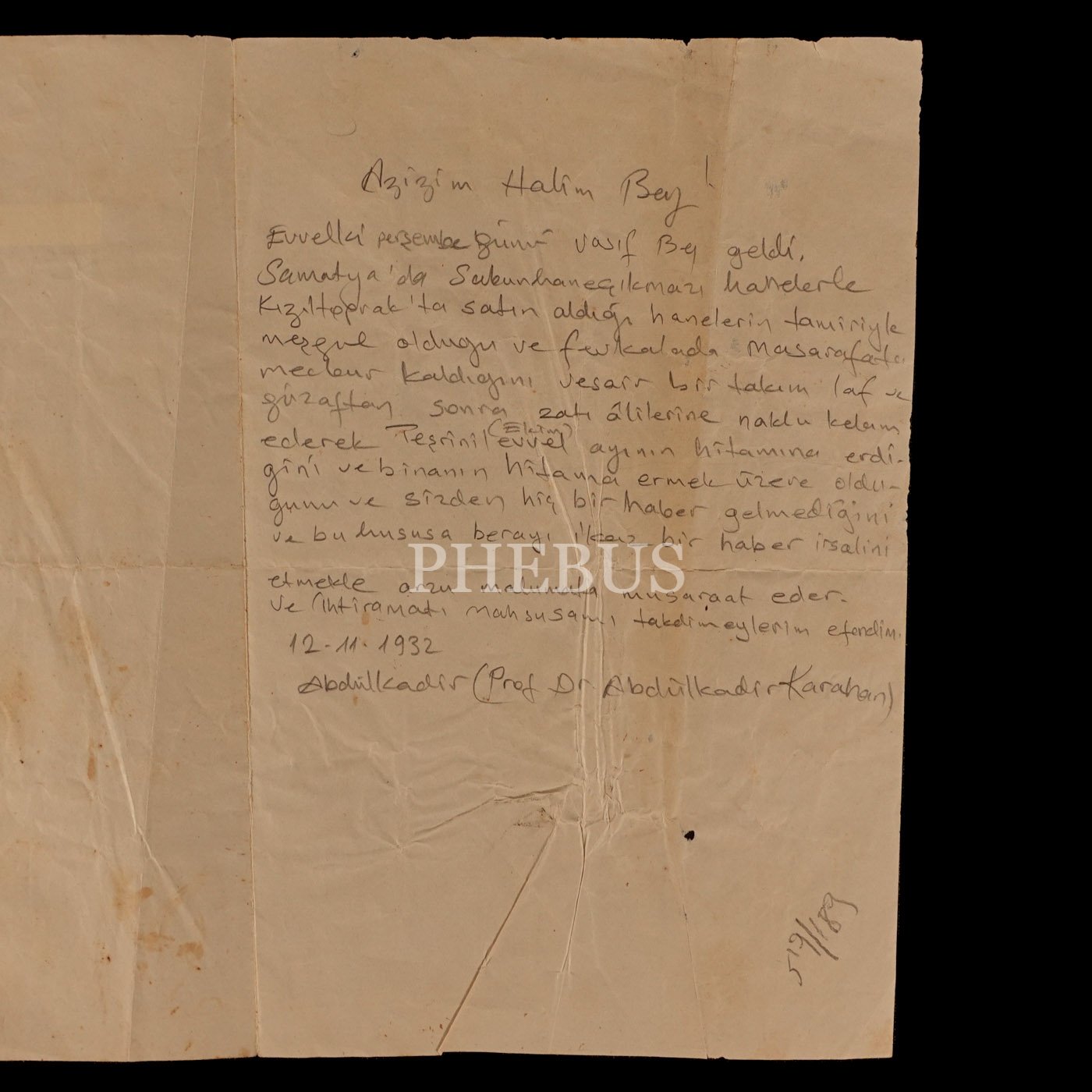 Abdülkadir Karahan´ın Halim Özyazıcı´ya hitaben kaleme aldığı 12 Kasım 1932 tarihli mektubu, 26x20 cm...