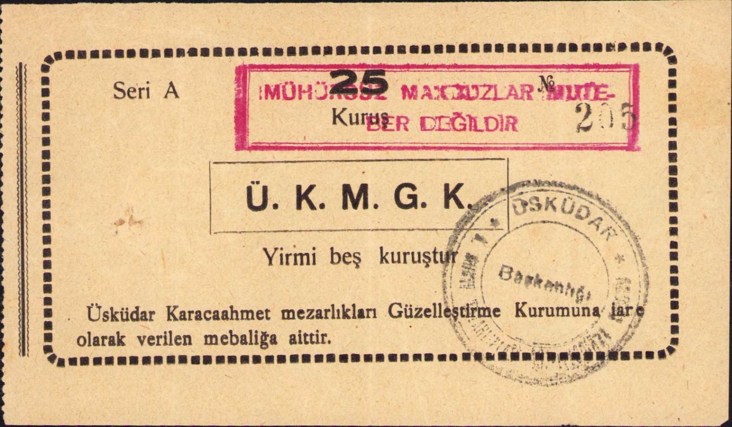 Üsküdar Karacaahmet mezarlıkları Güzelleştirme Kurumuna ait yirmi beş kuruşluk makbuz, 12x7 cm