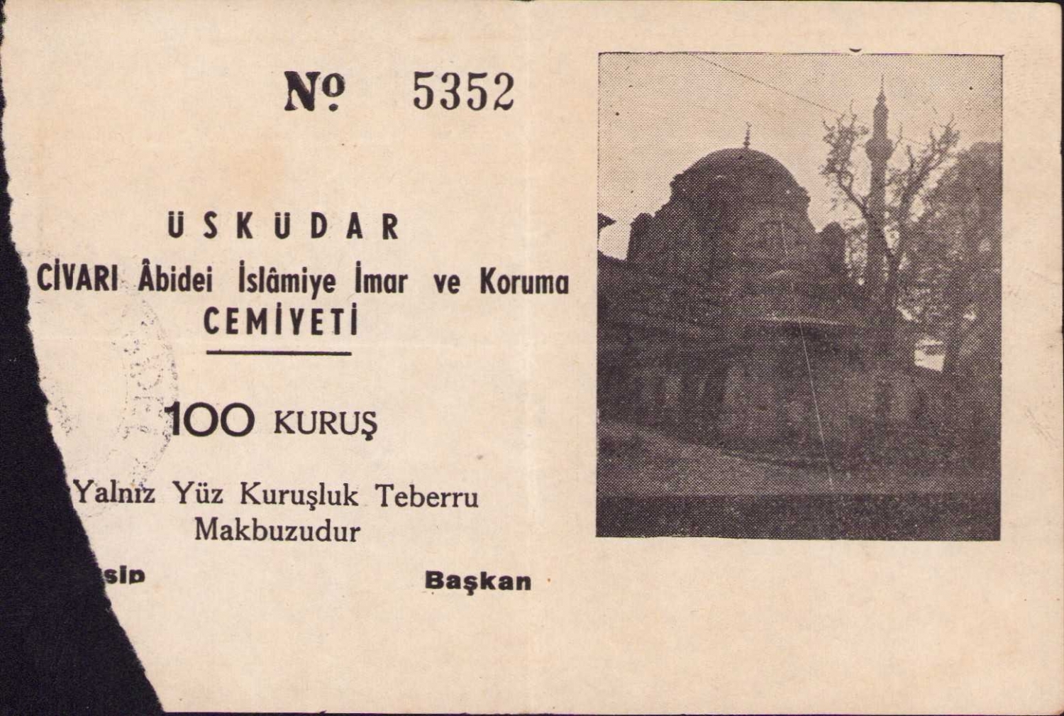Üsküdar civarı Abidei İslamiye İmar ve Koruma Cemiyeti teberru makbuzu, bir kenarı yok, 12x9 cm