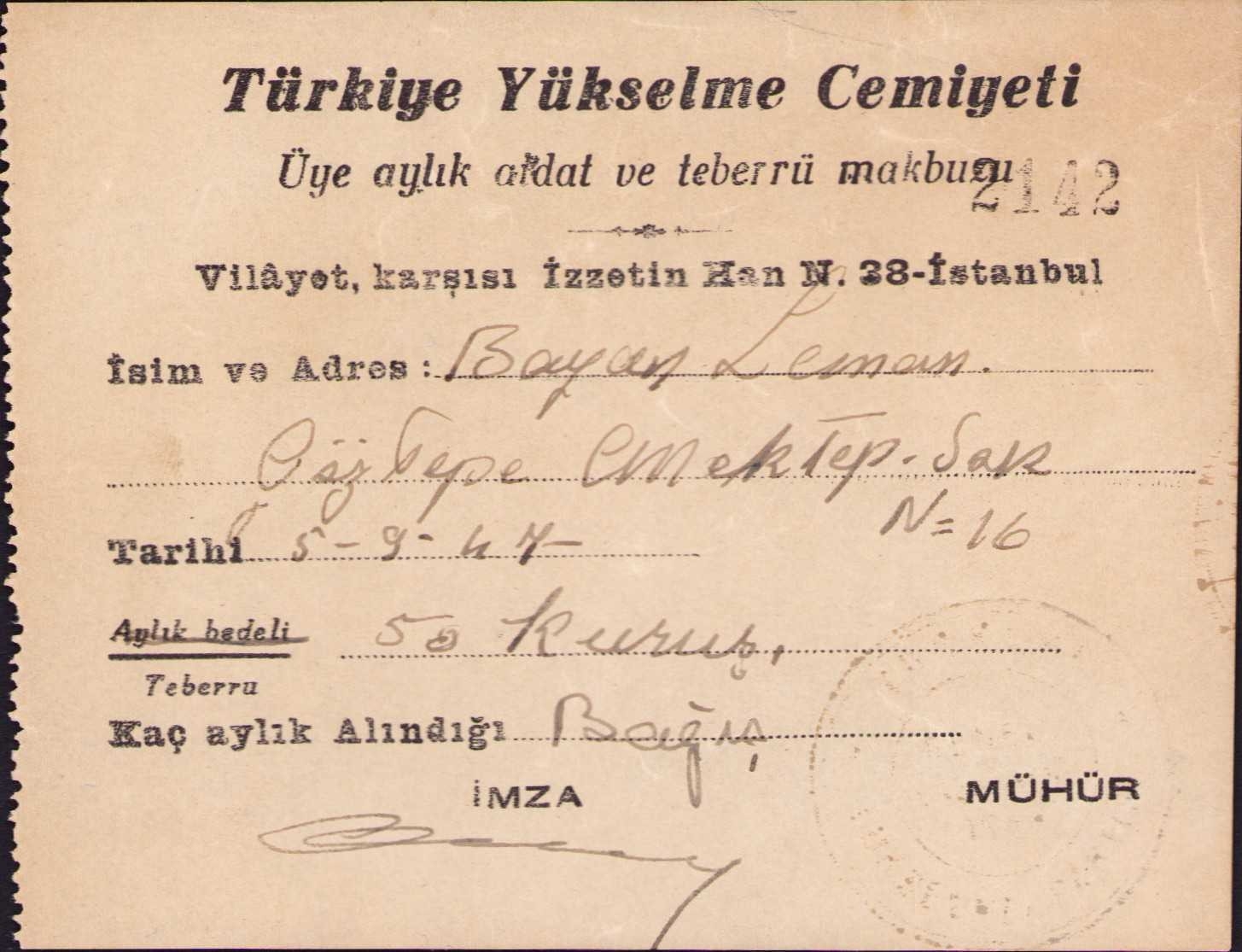 Türkiye Yükselme Cemiyeti teberru makbuzu, 11x9 cm
