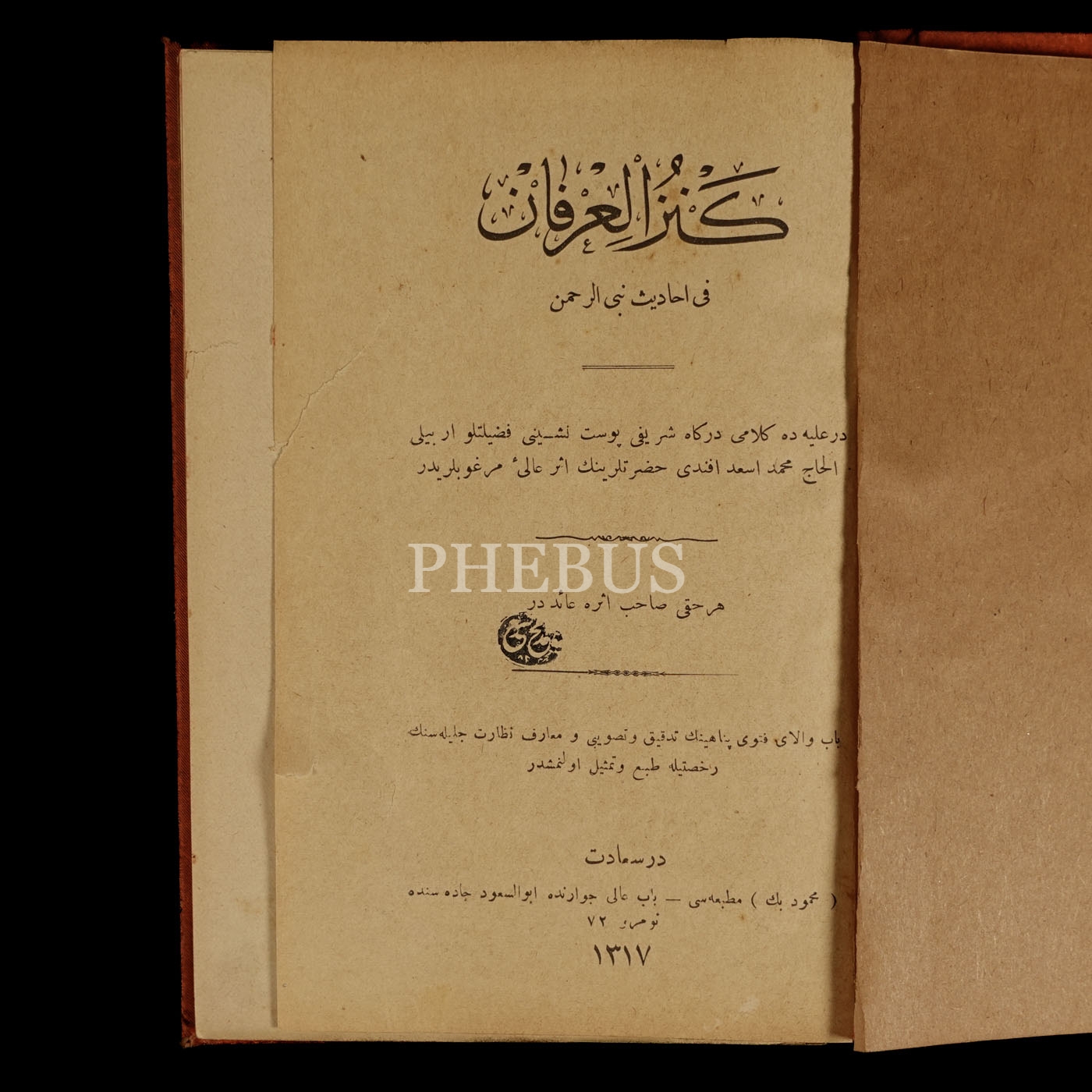 KENZÜ´L-İRFAN Fİ EHADİS-İ NEBİYÜ´R-RAHMAN, El-Hac Mehmed Esad, 1317, Mahmut Bey Matbaası, 182 sayfa, 14x21 cm...