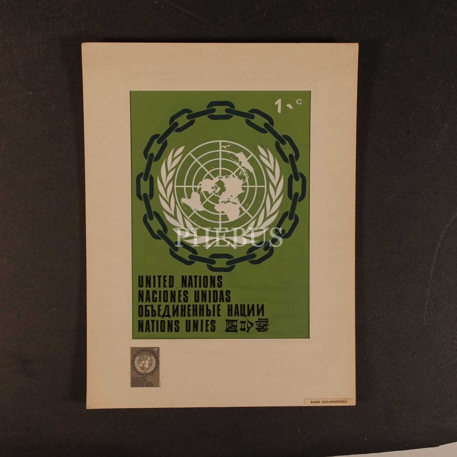 Ressam A. Baber Kocamanoğlu tarafından tasarlanan Birleşmiş Milletler (United Nations) pulunun orijinal çizimi, çizim 15,5x21,5 cm, paspartu 24x32 cm...