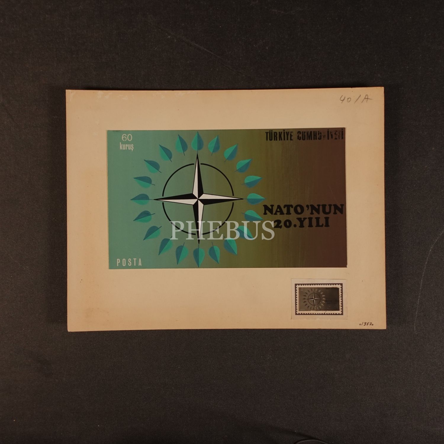 Ressam A. Baber Kocamanoğlu tarafından tasarlanan "NATO´nun 20. Yılı" konulu Türkiye Cumhuriyeti Postaları pulunun orijinal çizimi, çizim 23x13 cm, paspartu 30x23 cm...